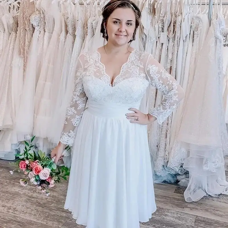Простое Короткое свадебное платье, 2021 искусственное кружевное шифоновое платье трапециевидной формы с длинным рукавом и аппликацией, длина ниже середины икры