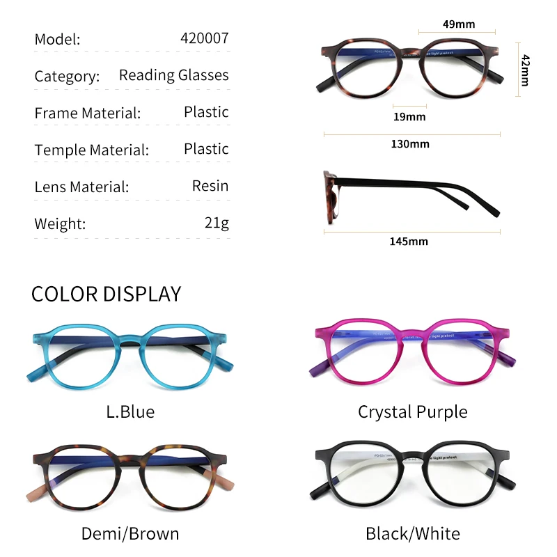 Тип: очки для чтенияПол: для женщин/мужчинМатериал оправы: пластикМатериал линз: пластикВес линз: 21 гЭластичная зеркальная Ножка: эластичность ± 30 градусовЦвет: черно-фиолетовый кристаллПрочность: 000 /+ 1,00/+ 1,50/+ 2,00/+ 2,50/+ 3,00/+ 3,50/+ 4,00Размер очков: как на картинке (прибл.)Высота линз: 42 мм'Ширина линз: 49 ммКоличество: 1 шт.Примечание:Переход: 1 см = 10 мм = 0,39 дюймаЕсть Розничная упаковка.Допускается погрешность в 1-2 см из-за ручного измерения. Пожалуйста, убедитесь, что вы не против, прежде чем сделать заказ.Из-за разницы между различными мониторами изображение может не отражать реальный цвет изделия. Спасибо!Посылка входит:1 очки для чтения 1 коробка