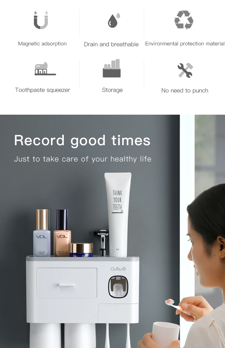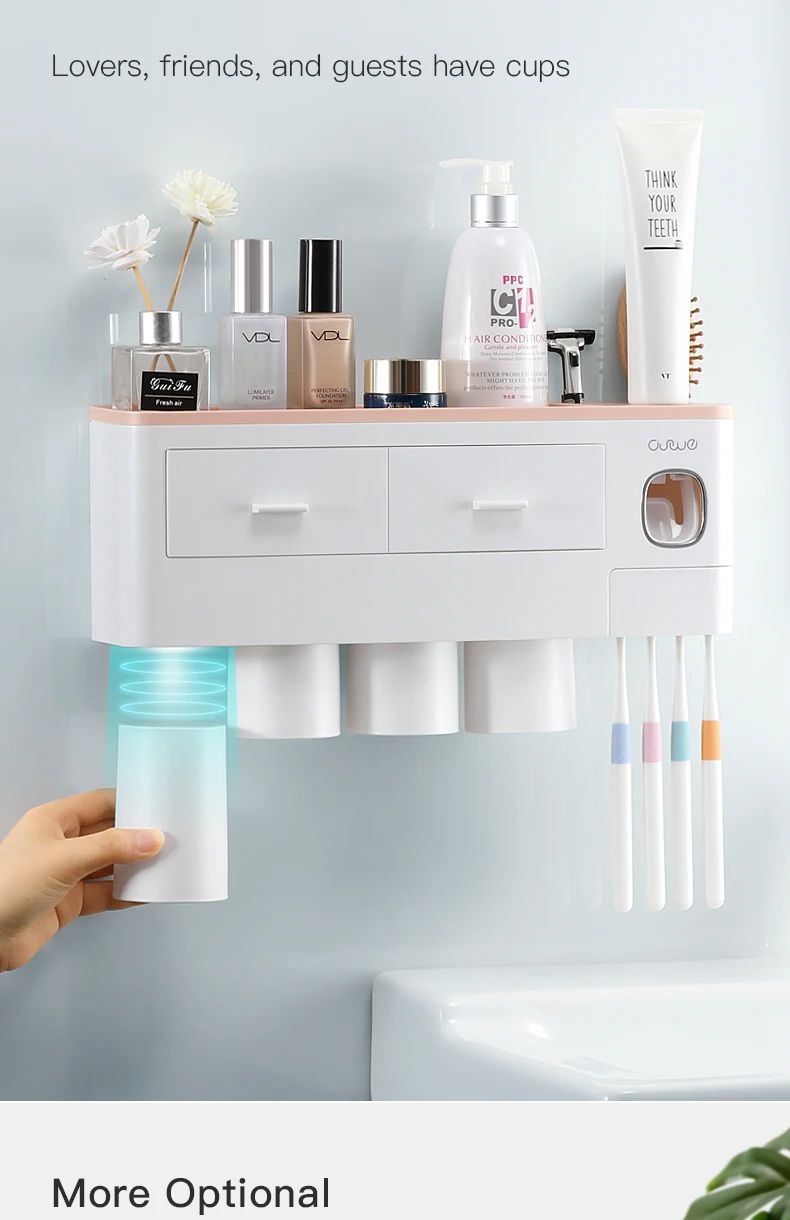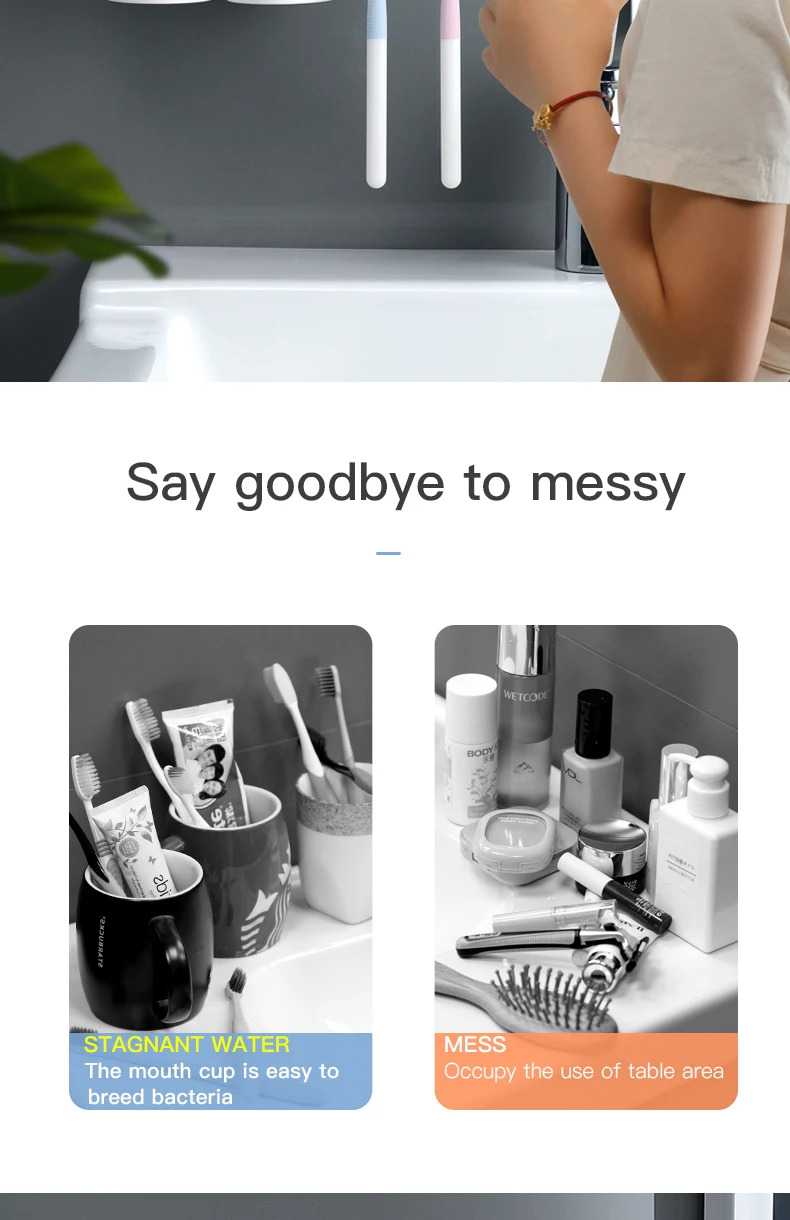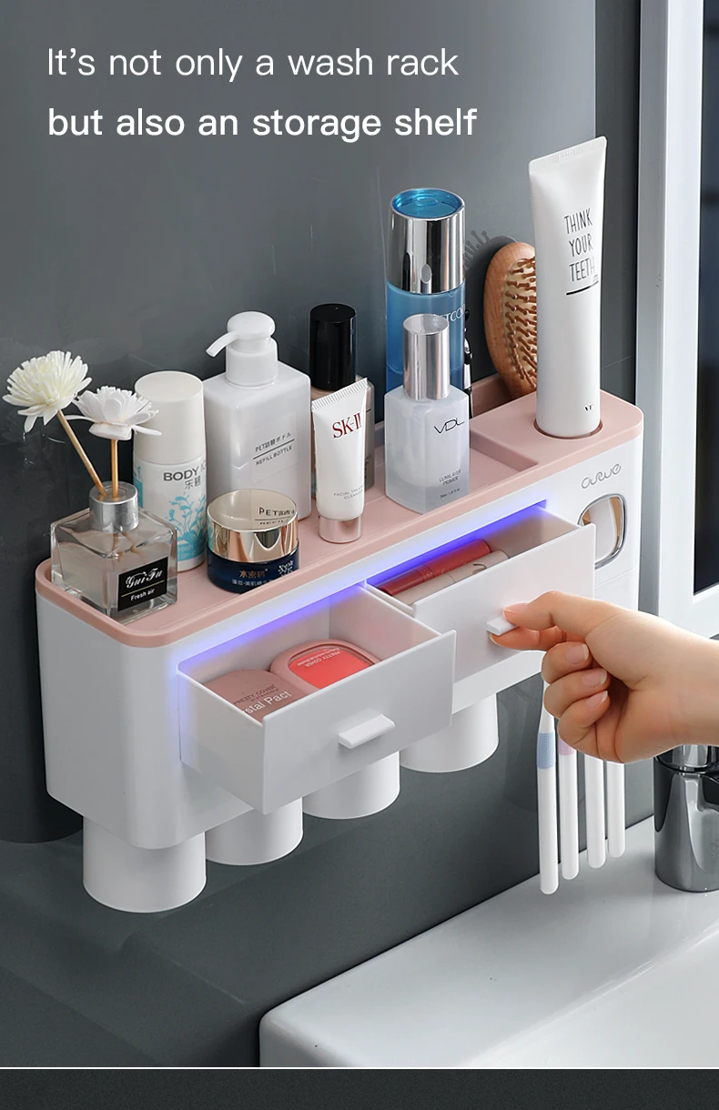 Особенности1. Магнитная присоска, подвешенная вверх дном без воды2. Установка без перфорации, отсутствие повреждений поверхности стены, твердая адгезия, сильная несущая способность3. Многофункциональная стойка для хранения, Верхняя полка + рифленый отсек + дизайн ящика, аккуратно хранится, более удобноПараметрыЦвет: синий/розовый/серыйХарактеристики: 2 чашки, 3 чашки, 4 чашкиРазмер: как показано на картинкеМатериал: АБС-пластикПримечание:При установке, пожалуйста, очистить стены сухой тряпкой, а затем вставьте non-маркировочная наклейка на гладкую стену, нажмите, чтобы выхлопной воздух внутри, затем установите Корпус держателя зубной щетки (эффект будет лучше после 24 часов)