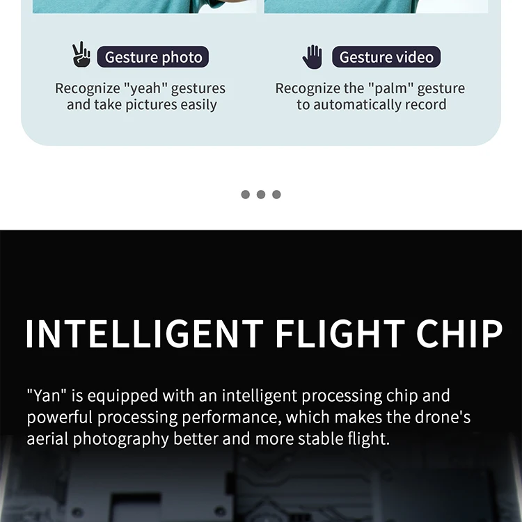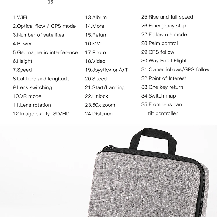 ● Двойной режим GPS/ГЛОНАСС● Регулируемая камера 4K HD● 5G передача изображения Wi-Fi на большие расстояния● Безголовый режим● ОПТИЧЕСКИЙ режим позиционирования потока● Передача изображения в реальном времени● Интеллектуальный контроль● Объемный полет● Полетный путь● Траектория полета● Складной портативный фюзеляж● Возврат одной кнопки● Одно нажатие/посадка● Съемка жестов● Дистанционное управление фото и видео записью● Бесщеточный двигатель● Переключатель скорости● Электрический забор● Функция поиска самолетов● MV функции: фильтры, видеоэффекты, добавление фоновой музыки, обмен фотографиями/видео● Около 229 г Сверхлегкий: регистрация не требуется, что отвечает требованиям безопасности веса микро дронов в большинстве стран и регионов