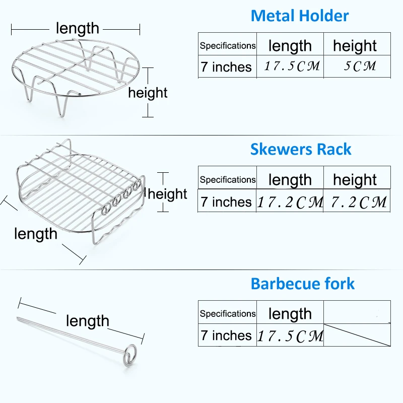 Особенности:1. Наши аксессуары для фритюрницы изготовлены из пищевой нержавеющей стали марки 304, прочные и термостойкие, печь безопасна.2. Двухслойная стойка для более универсальных рецептов фритюрницы. Максимизируйте нагревающую поверхность пищи, используйте Шпажки для шейша кабоба на верхнем слое и другие продукты на слое решетки.3. Не прилипает и не ржавеет высококачественная нержавеющая сталь, легко моется, каждая воздушная фритюрница аксессуары безопасна для посудомоечной машины для быстрой и беспроблемной очистки, просто проскользните в посудомоечной машине и получите ваши руки бесплатно.4. Край стойки отполирован до гладкой поверхности без шероховатого пятна, Защитите вашу руку при стирке или удержании.5. Плотная параллельная линия предотвращает падение пищи.Спецификация:Семидюймовый Размер гриля: 17,2*7,2 смЧетыре выпечки контакты: 17,5 смСемидюймовые высокий Пароварка: 17,5*5 смPlate rack: 15,5*8,5 смМатериал: нержавеющая стальПримечание:1. Из-за различных настроек монитора и светильник эффект, фактический цвет изделия на фото может быть s светильник ly отличается от представленного на фотографиях.2. Возможны отклонения на 1-3 см вследствие измерений вручную.