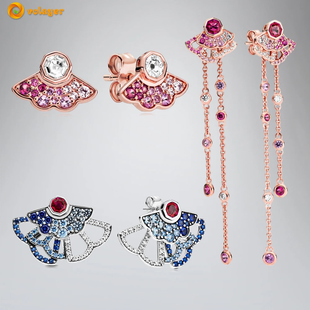 Серьги-гвоздики Volayer, серебро 925 пробы, в китайском стиле, с синим и розовым веером, серьги-гвоздики с фианитами