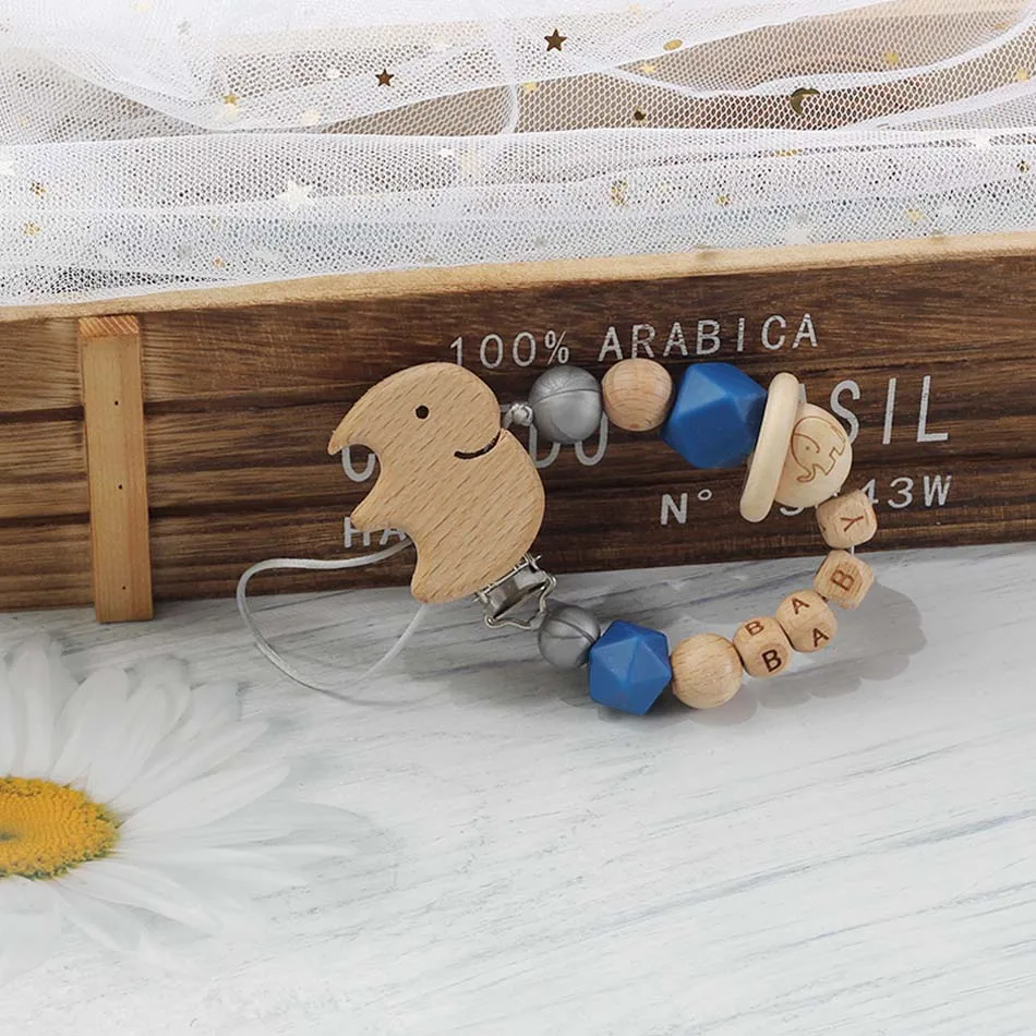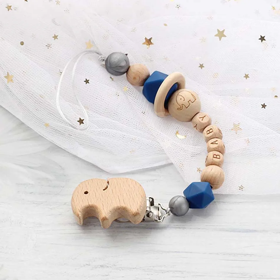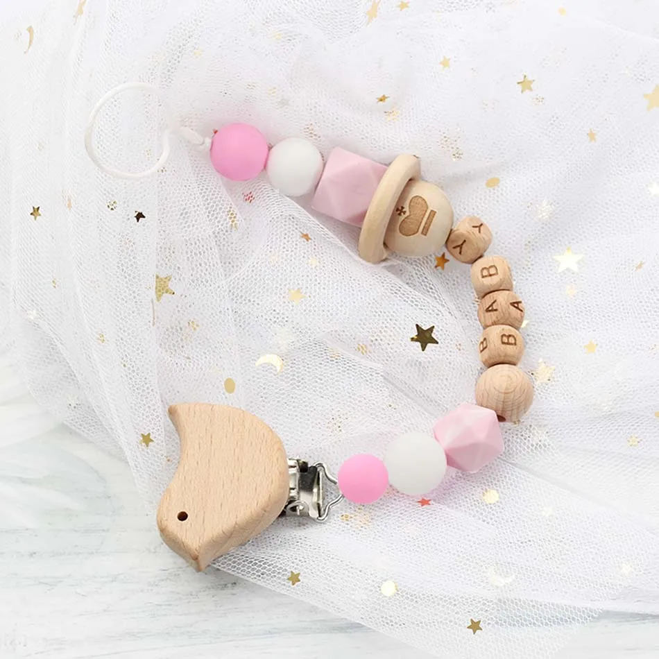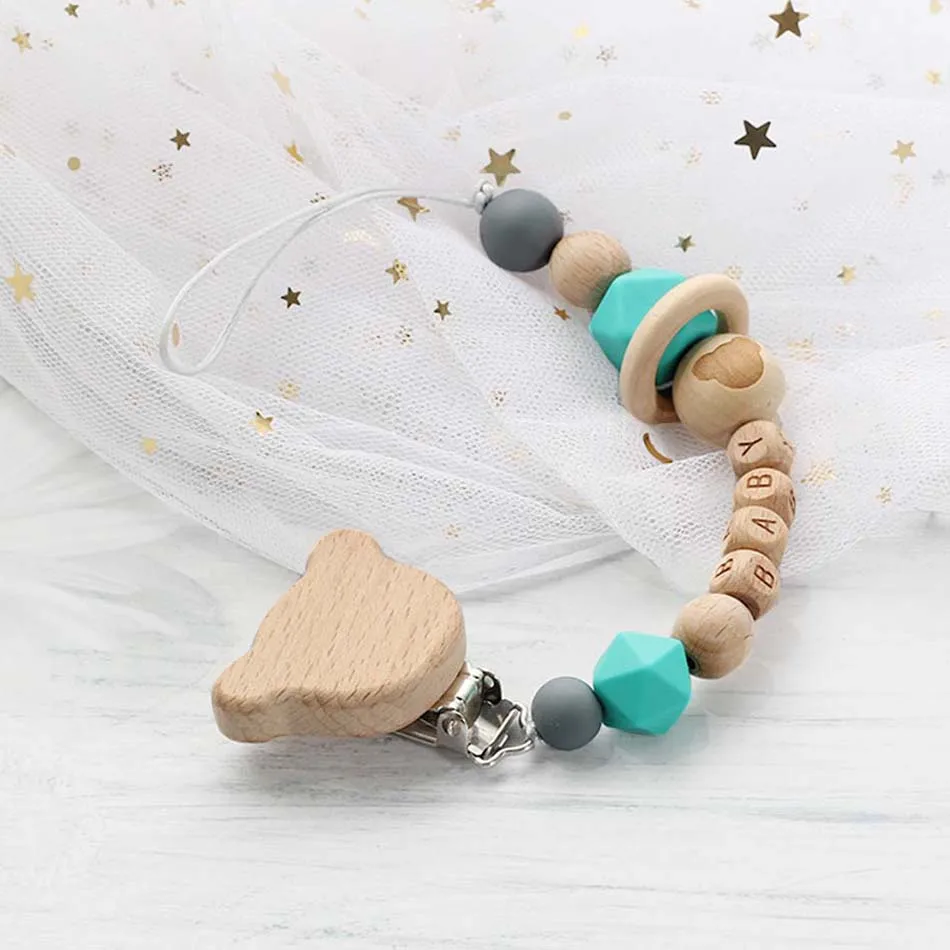 Зажим для соски с именем ребенка, силиконовые бусины из бука, зажим для соски, цепочка для соски, игрушки для прорезывателя, держатель для соски