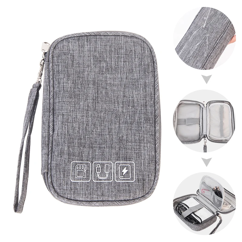 Внутри:1. Сетчатый мешок на молнии для карты памяти.2. Эластичный сетчатый мешок может держать флэш-накопитель, наушники и т. Д.3. Эластичная лента для фиксированного внешнего аккумулятора или других предметов.Материал внешней части:1. Если вы хотите получить Пользовательский логотип2. Съемное Сиденье с ручкой3. Водонепроницаемая ткань