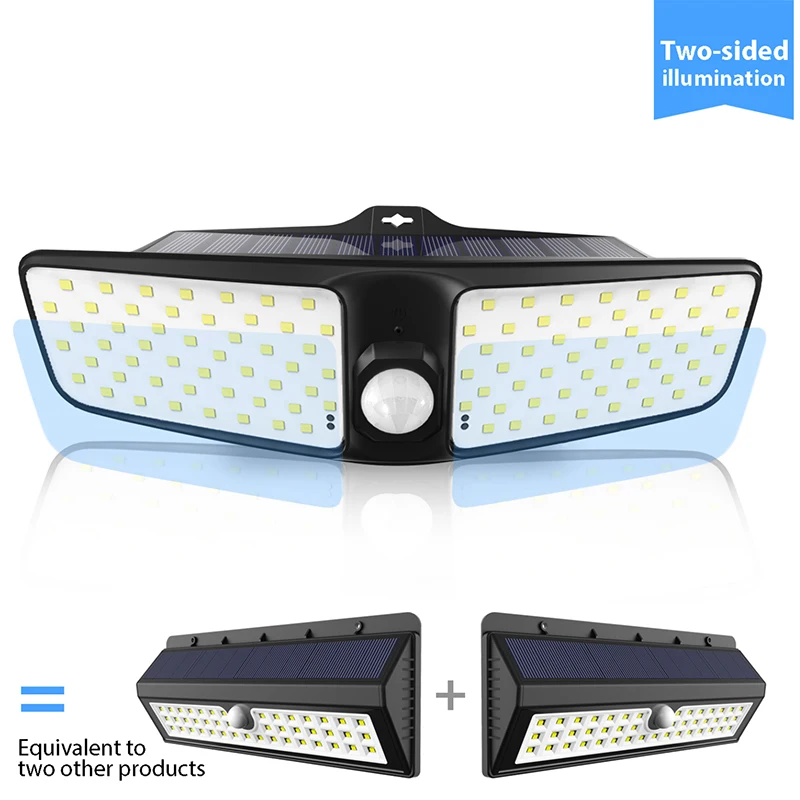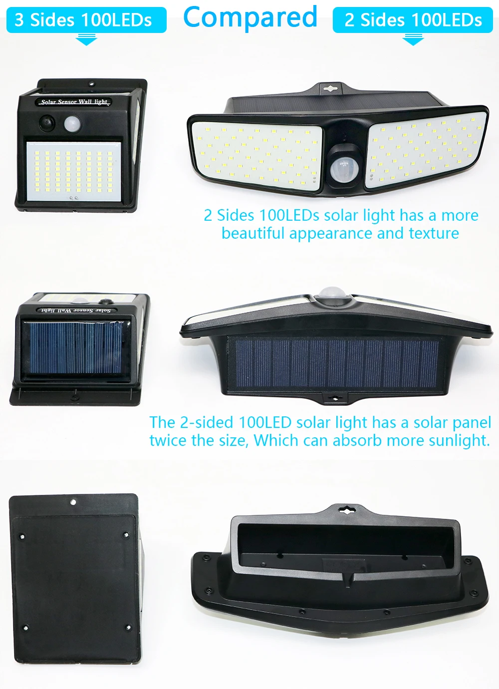Б. 2-сторонний 100-светодиодный солнечный светильник имеет солнечную панель в два раза большего размера, которая может поглощать больше солнесветильник.