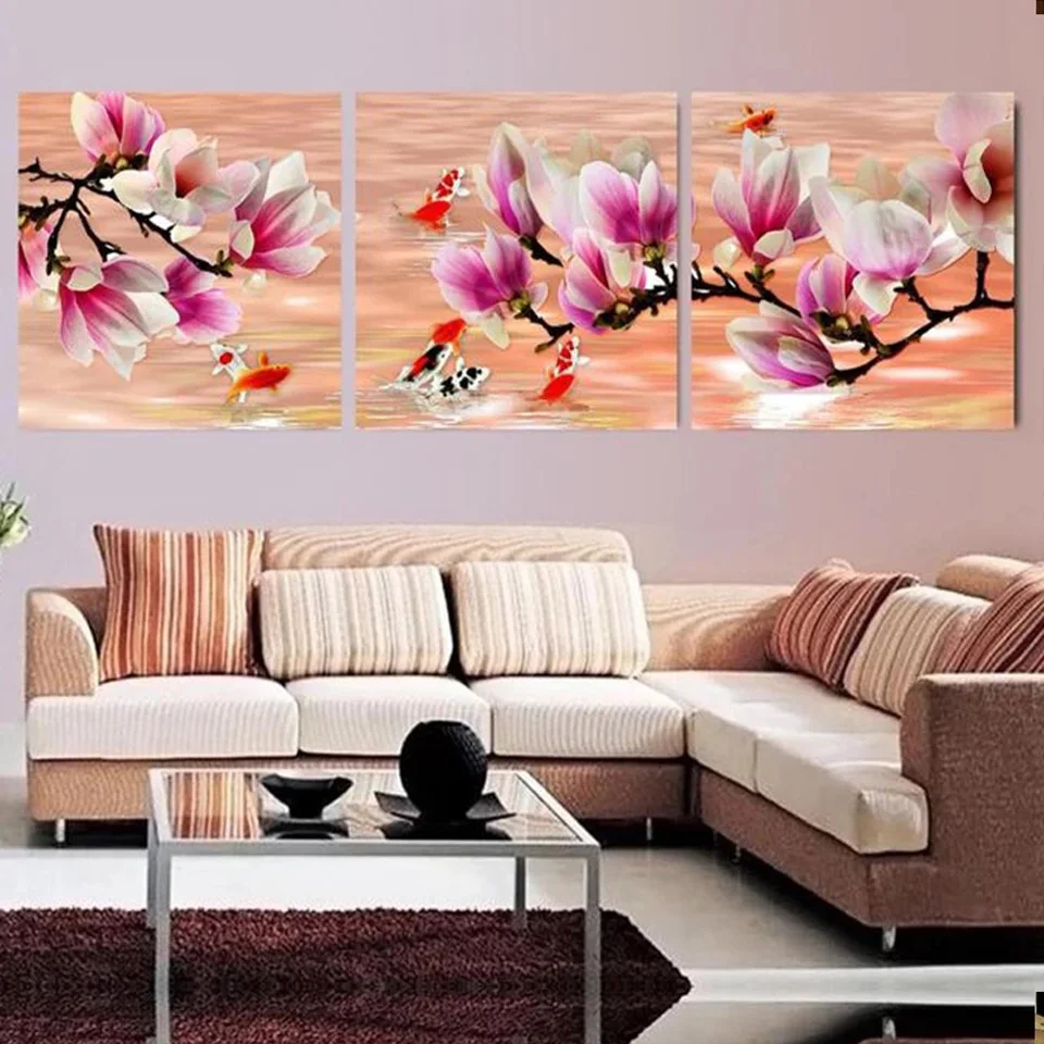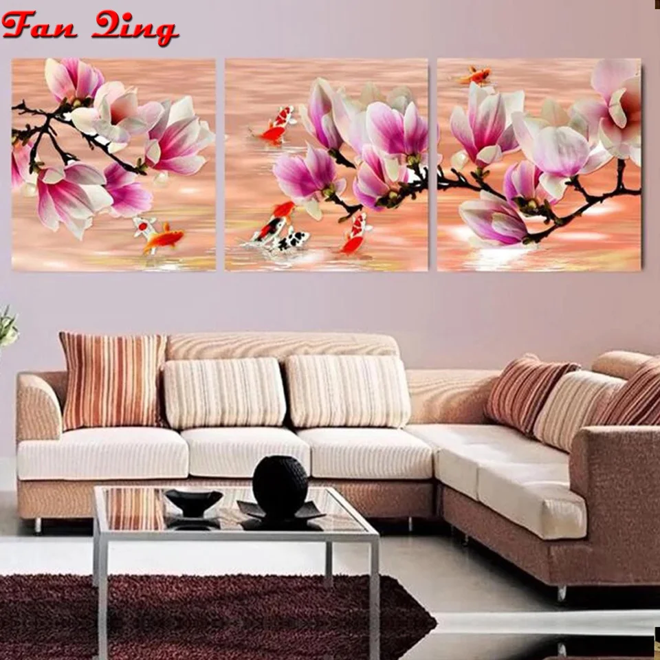 Триптих Алмаз Картина с магнолией цветы рыба мозаика полный квадратные/круглые стразы вышивка крестиком 3 шт. домашний декор