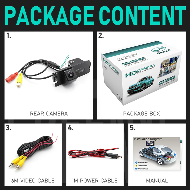 1. CVBS/AHD камера заднего вида2. Коробка для посылка3. Видео кабель 6 м4. Кабель питания5. Руководство пользователя