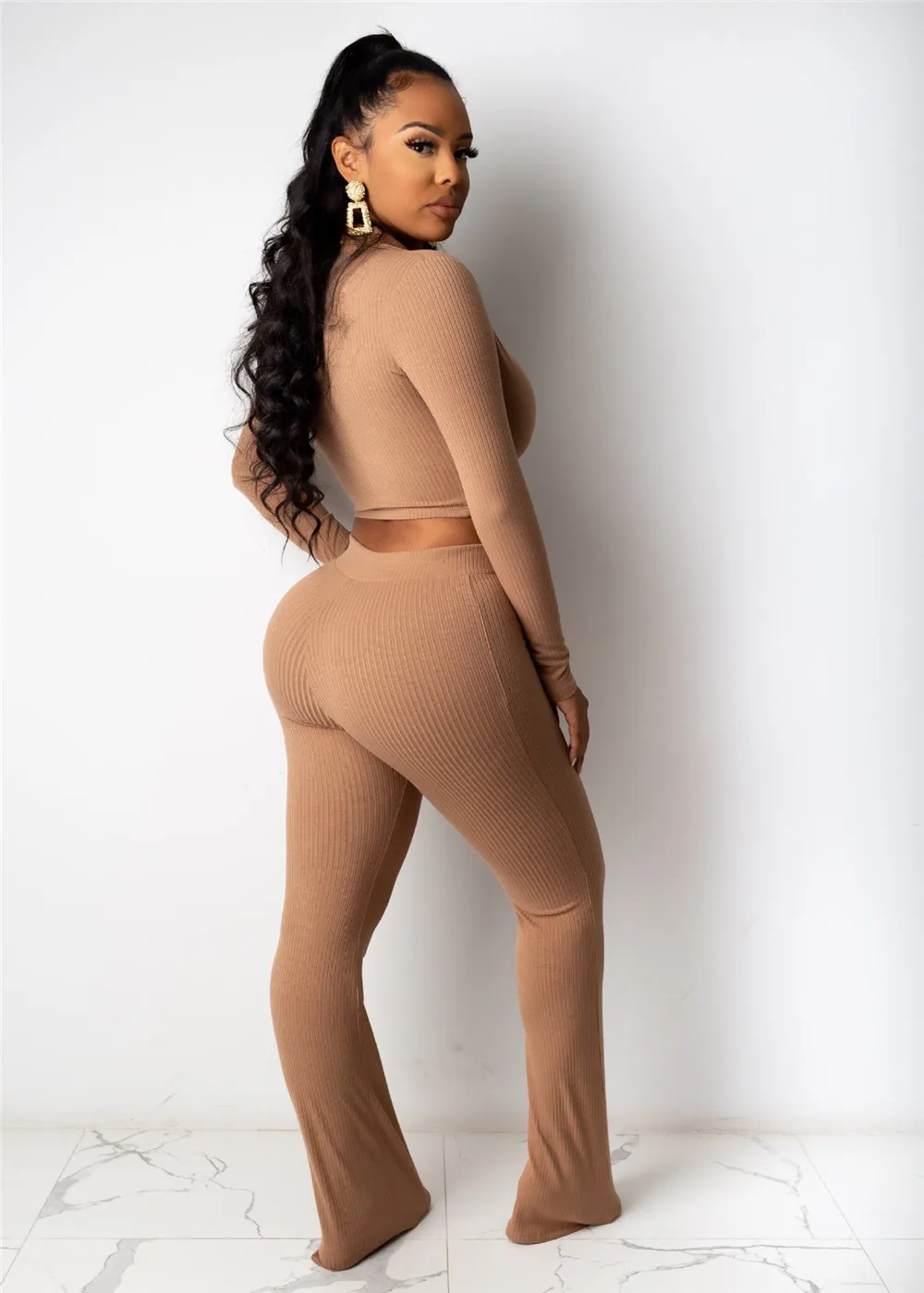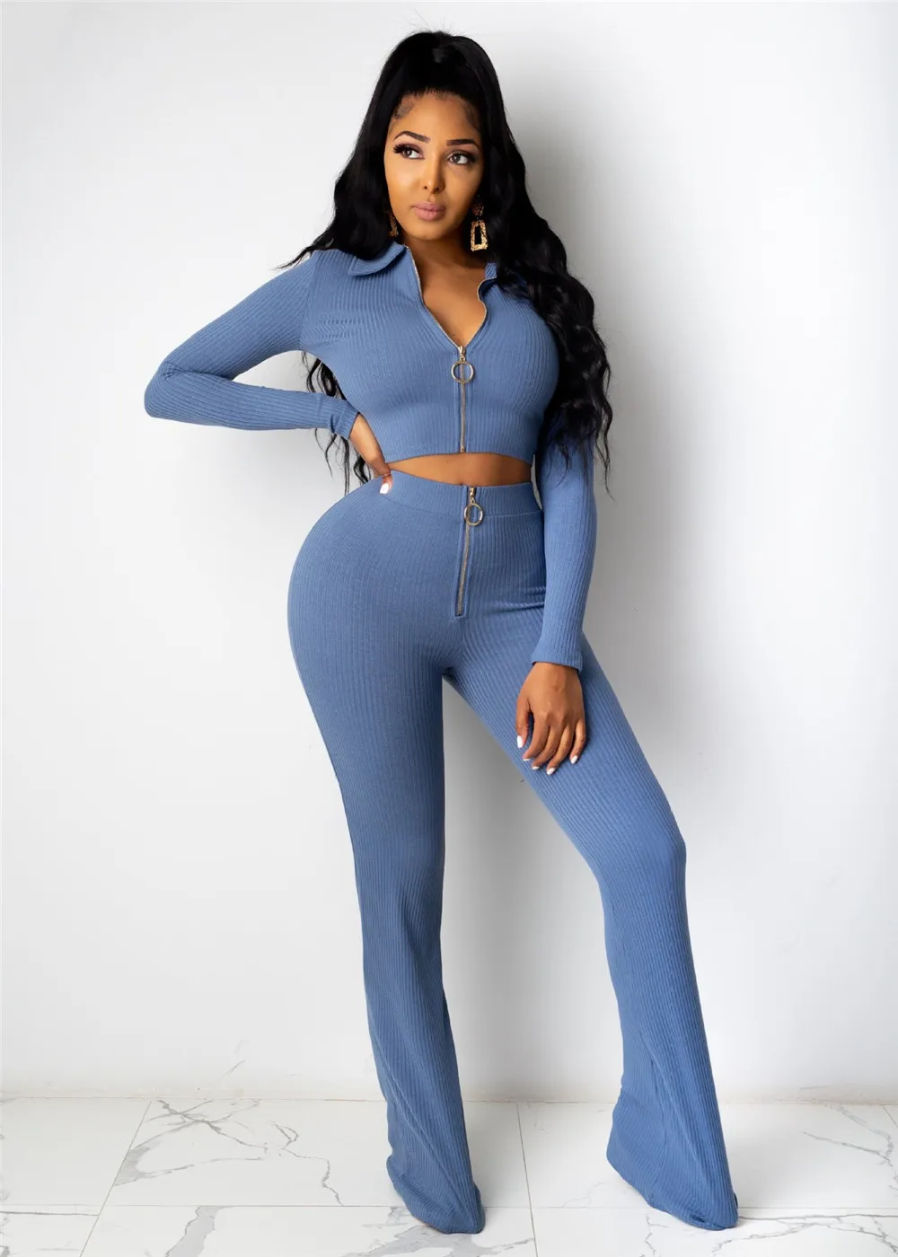 Ребристый вязаный однотонный Элегантный комплект на молнии, женская одежда, зимний облегающий укороченный топ с длинными рукавами и расклешенные штаны, комплект из 2 предметов