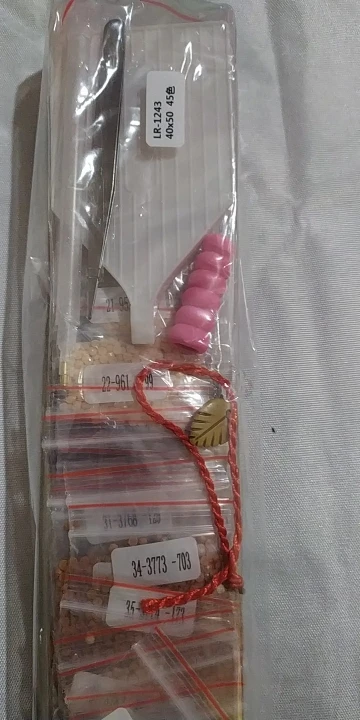 Пришло быстро, очень хорошо упаковано, холст намотан на валике, никаких заломов. Детализация крутая. В наборе двойной стилус, удобный держатель и лоток, хороший пинцет, в подарок небольшой браслетик. Очень довольна, буду заказывать в этом магазине еще. Спасибо продавцу!