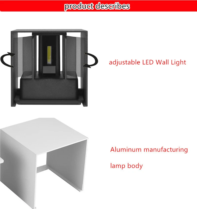 Характеристики:Название товара: наружный и внутренний водонепроницаемый светодиодный настенный светильникФорма корпуса светильника: квадратная, круглая.Цвет корпуса светильника: белый, серый, черный (рекомендуем).Мощность Светодиодный: 12 ВтНапряжение: 85 ~ 265 В переменного токаТип светодиодный да: COBУгол свечения: РегулируемыйДиммируемый: нетМатериал: алюминийЦвет и температура:Теплый белый (2800-3200K);Холодный белый (6000-6500K)Вес изделия: квадрат 500 г, Круглый 545 г.Срок службы: более 50000 часовГарантия: 2 года