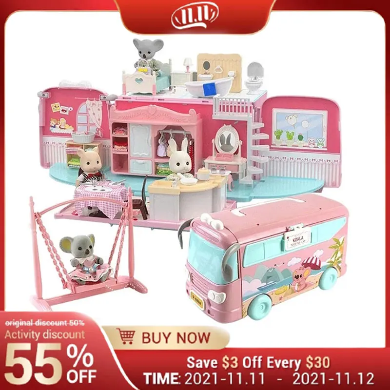 Кукольный домик автобус хлебобулочный магазин дуплексная игрушка для ролевых игр машина Япония лесное животное кролик медведь белка Koala Семья Спальня Кухня девушки