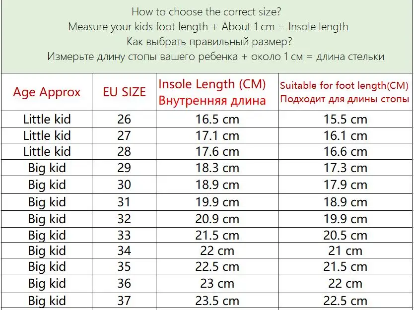 Дорогие друзья: Поскольку все размеры детской обуви отличаются, при заказе детской обуви вы должны соответствовать нашим размерам и внутренней длине. Согласно длине стельки. (длина стельки = длина стопы + 1 см) Американский размер не является стандартным, просто удобно для вас сделать заказ. Удобная длина стопы составляет около 1 см. И из-за длительного времени доставки авиа-отправление Почты Китая и ребенок быстро вырастет, пожалуйста, выберите обувь большего размера для вашего ребенка. Пожалуйста, выберите правильный размер. Вся обувь будет отправлена с пузырчатыми сумками, без коробок!