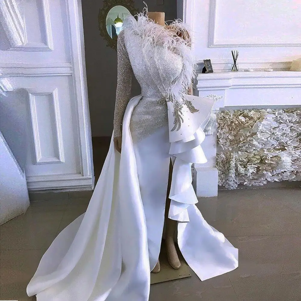 2020 арабское Aso Ebi блестящее Сексуальное Дешевое вечернее платье на одно плечо с кристаллами платья с перьями для выпускного вечера облегающие вечерние платья