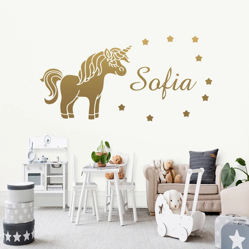 Настенные Стикеры с именем на заказ, персонализированные наклейки, наклейка Единорог для детской комнаты, декоративные обои, плакат, Детская роспись