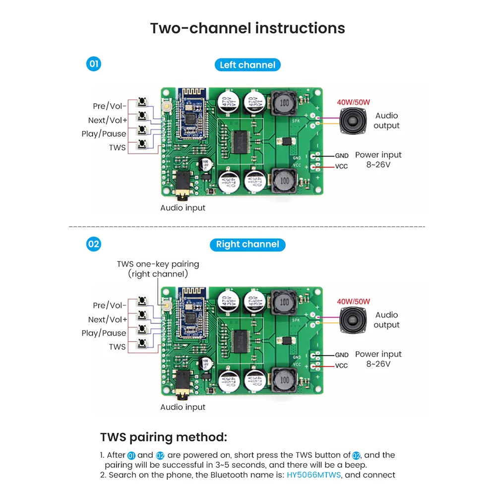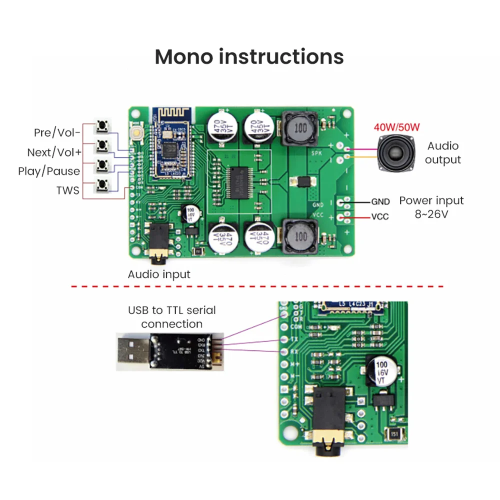Усилитель мощности AIYIMA TPA3118 Bluetooth 5.0, аудиоплата 50 Вт, монофонический усилитель звука, порт TWS Sup, последовательный порт, переименование AUX