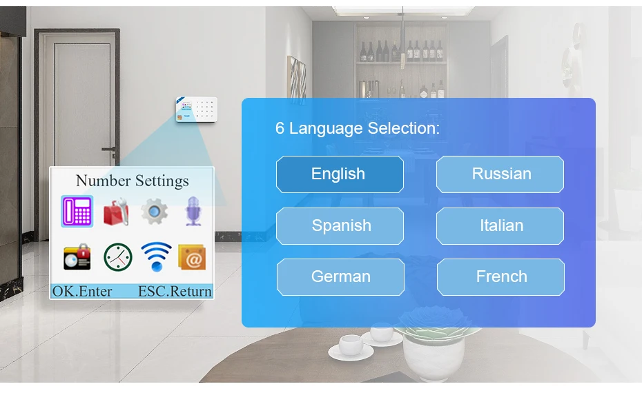Оснащенная многоязычным дисплеем меню и голосовыми подсказками, эта панель сигнализации поддерживает переключение на 6 языков: английский, немецкий, итальянский, русский, испанский, французский.