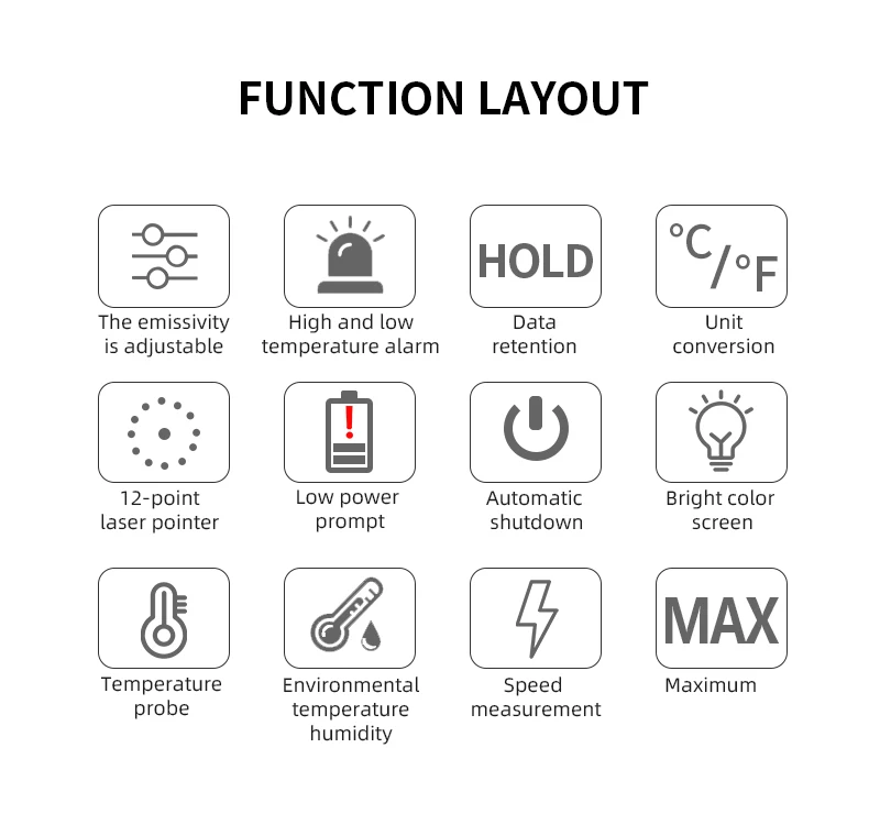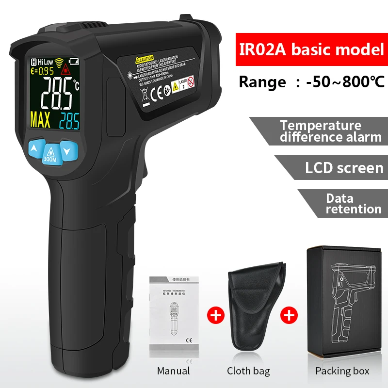 Примечание: Батарея не входит в комплект модели: IR02A,IR02B,IR02C Диапазон измерения температуры: IR02A:-50 ~ 800C IR02B:-50 ~ 800C, с температурным зондом IR02C:-50 ~ 800C, с температурным зондом, температура окружающей среды:-10 ~ 60C, влажность окружающей среды: 0% ~ 100% RH плесень и температура точки росы D:S : 12:1 Излучение: 0,1 ~ 100 регулируемая Диапазон отклика: 8 ~ 14 мкм Лазерное позиционирование: 12 точечное кольцо, указывающее температуру чувствительной зоны Лазер:<1 мВт/630-670нм Уровень 2 Время отклика:<0.5s Разность температур: свободный набор верхнего предела и нижнего предела сигнализации в диапазоне температур Автоматическое выключение: 30 секунд