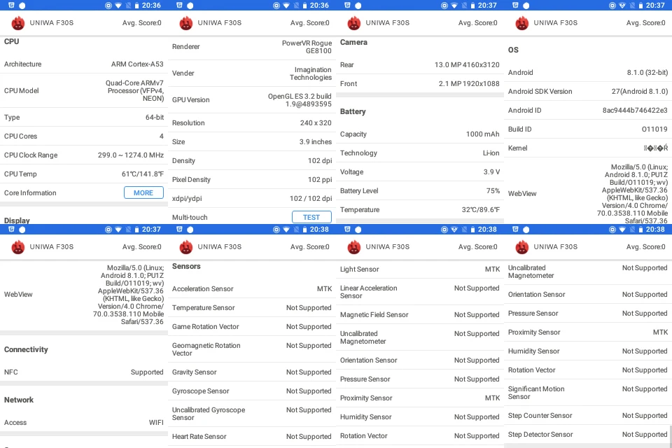 Модель № UNIWA F30S Класс водонепроницаемости IP54 Размеры 129,2*64,5*26 мм Вес нетто 220 г (включая батарею) Материал корпуса пластик Разблокированный сервис Одна SIM-карта micro SIM, один режим ожидания ОС Android 8,1 Oreo Процессор MT6739 Cortex A53 четырехъядерный, 1,3 ГГц; GPU: PowerVR Rogue GE8100 RAM 1GB RAM DDR3 ROM 8GB ROM, поддержка TF карт до 64GB максимально