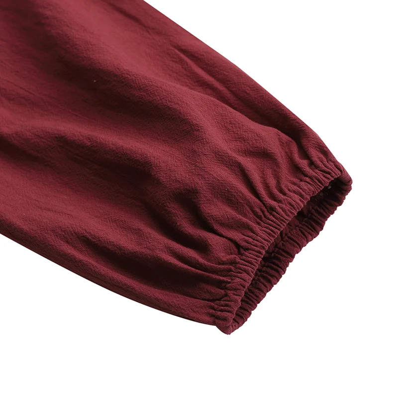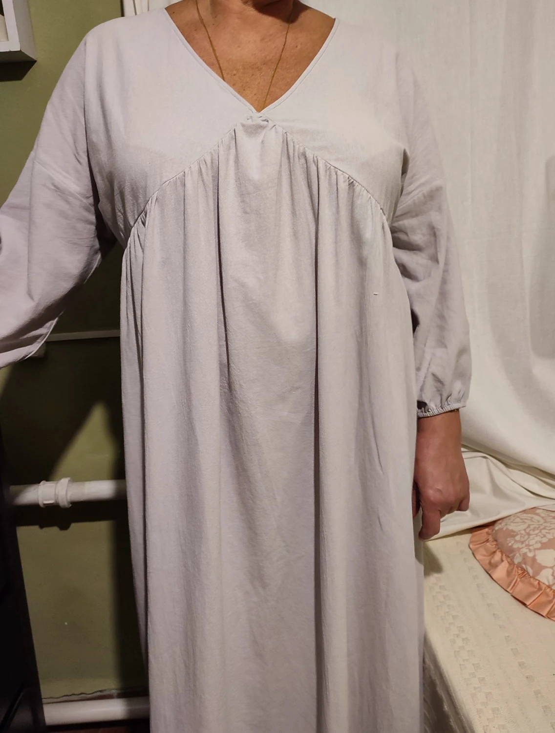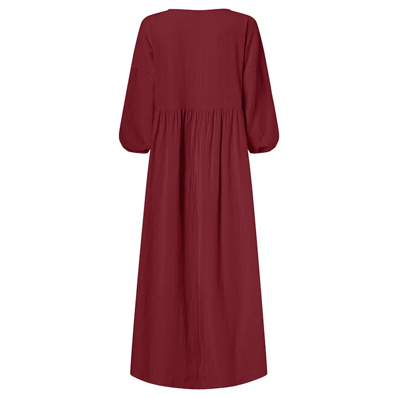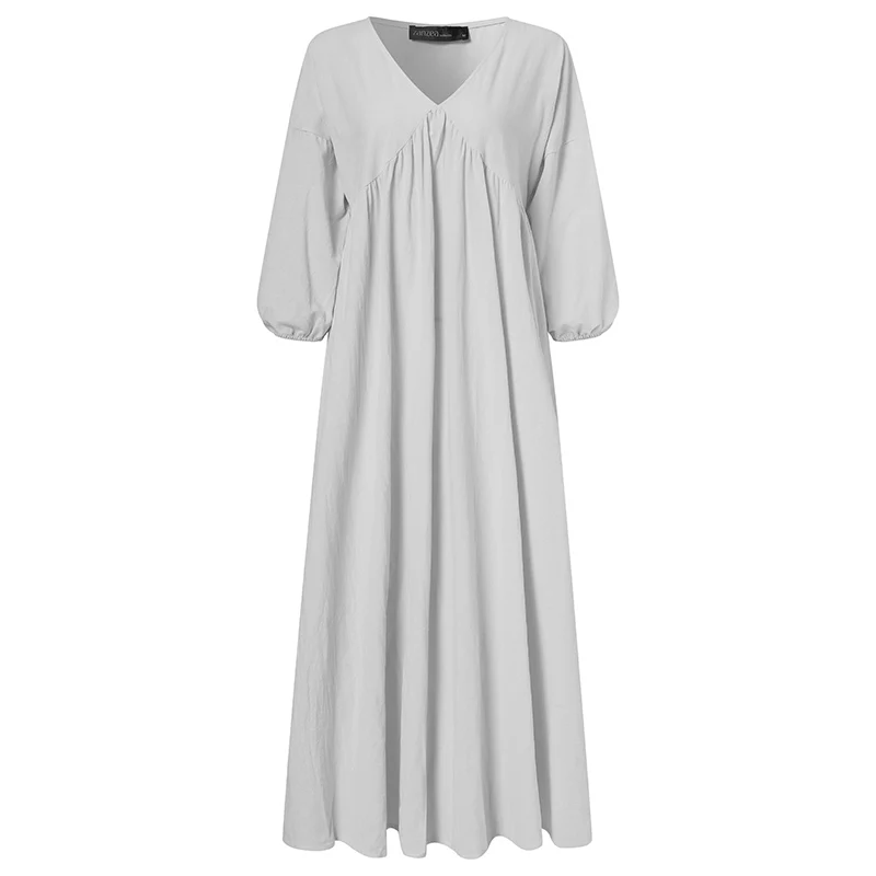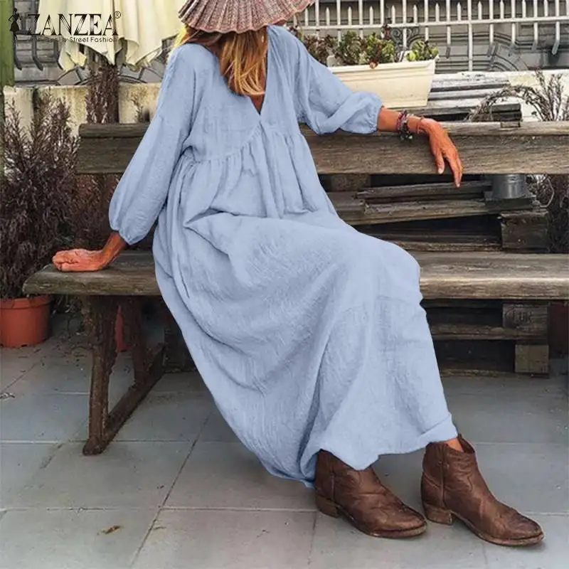 Женское длинное платье-макси, Осеннее однотонное платье из хлопка и льна с пышными рукавами и V-образным вырезом