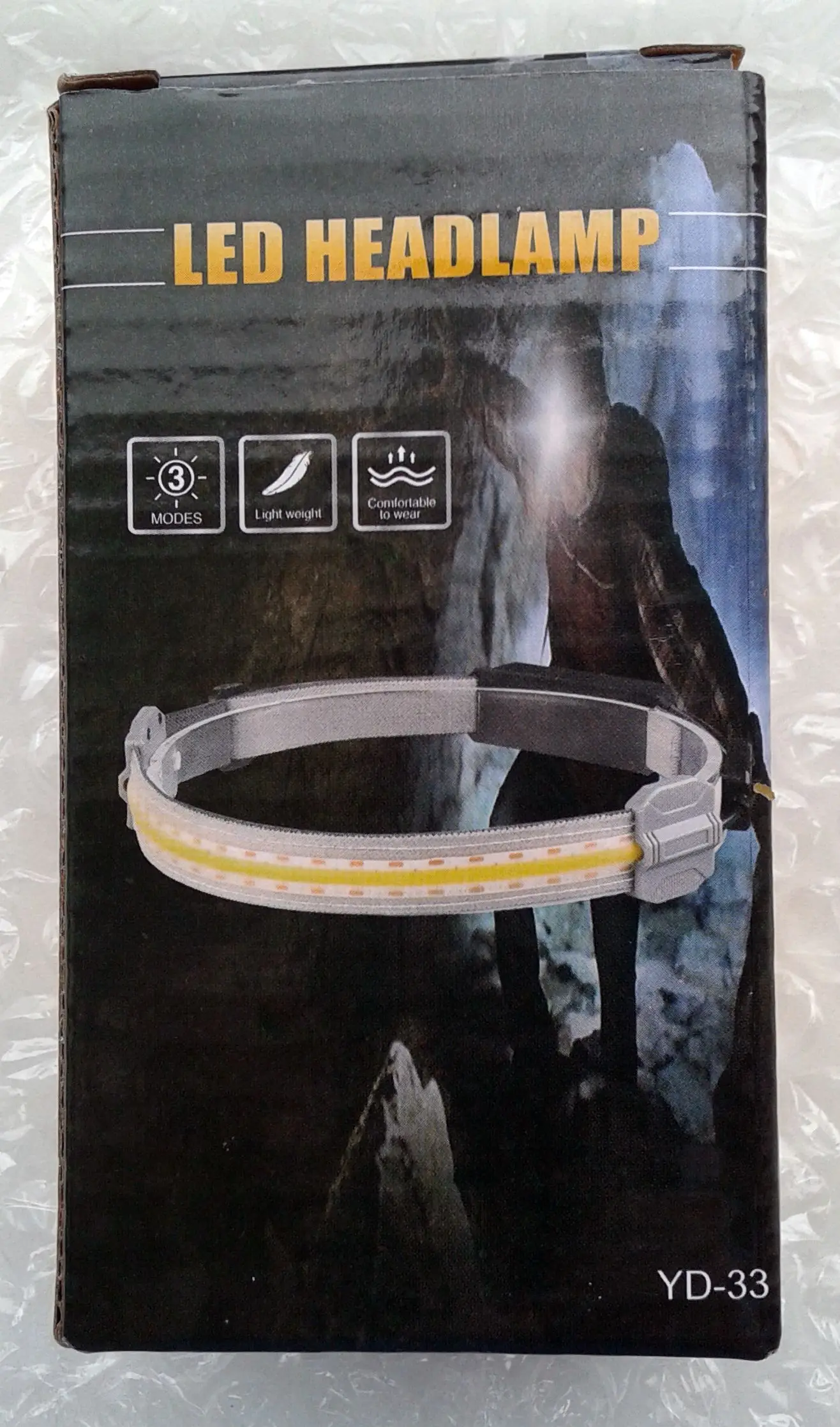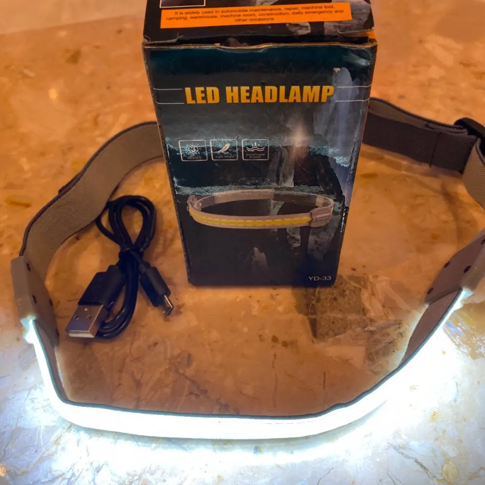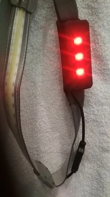 Заказал 11.01, получил 26.01.2021 (16 дней, быстро) в "Новой почте" Киева. Со скидкой в $1 обошёлся в $8.80. Приехал в почтовом пакете, обмотанный в "пупырку", в фирменной коробочке, без повреждений. Внутри, также в кулёчке из пупырки, налобник и шнур зарядки. Упаковка на 5+! Первое впечатление - всё аккуратно, хотя строчки швов неровные. Лёгкий, ремень с гибкой лентой хорошо сидит на голове, резинка растягивается. Для размеров головы от 52 до 64 см, по обхвату. Ниже ушей - не опустится. Светит рассеянным светом на расстояние до 2-3 м, что и хорошо для работы в пределах длины рук. Направленный узким лучом свет для этого неудобен! Яркости достаточно, чтобы не причинять дискомфорта. Три режима свечения: максимальный, средний и мигалка. Эти же режимы дублируются тремя красными светодиодами на блоке аккумулятора, сзади. Может сгодится собаке в качестве ошейника для выгула в тёмное время. Водоустойчивость сомнительна, лучше не мочить, даже пот с головы может попасть внутрь, на СД ленту.