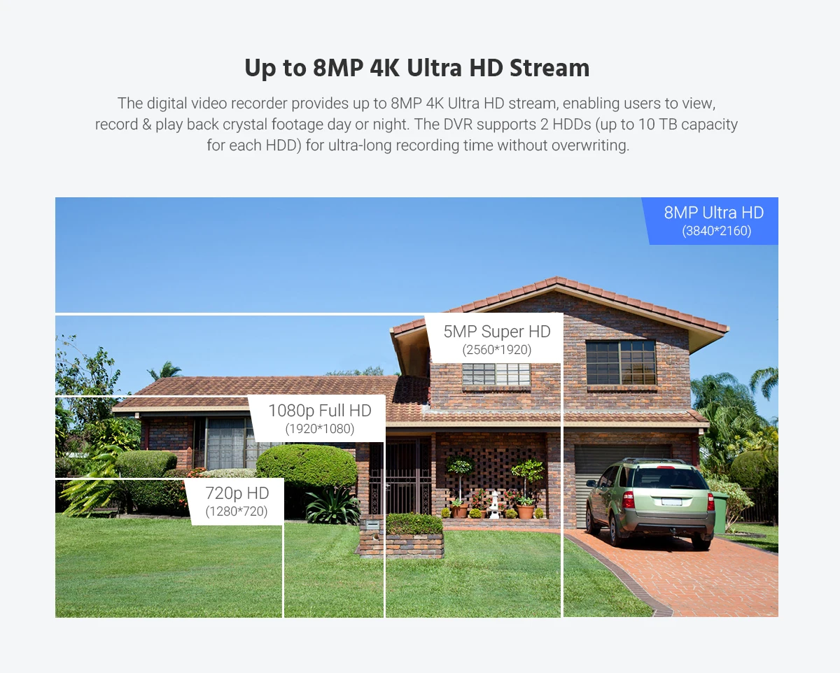 . До 8 МП 4K Ultra HD поток. Расширенный формат H.265 + видео. Мощная Совместимость 5 в 1. Пересечение линии и обнаружение проникновения. Маска для защиты конфиденциальности. Видео вскрытие/Обнаружение потери. Внезапное Обнаружение изменения сцены. Интеллектуальное обнаружение движения и оповещения. Неограниченное количество возможность удаленного доступа в любом месте и в любое время. Безопасный шифровки и протоколы. Видео выход 4K HDMI и 1080p