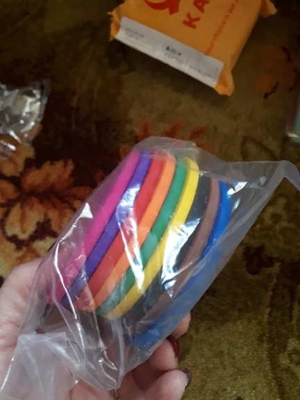 Посылка пришла быстро. Все как в описании, кружки яркие, без запаха, размером как ладонь взрослого человека.