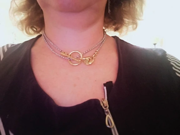 Чокер красивый, единственный момент, к сожалению, очень сильно бросается в глаза жёлтый цвет, он к сожалению дешевит вид чокера.