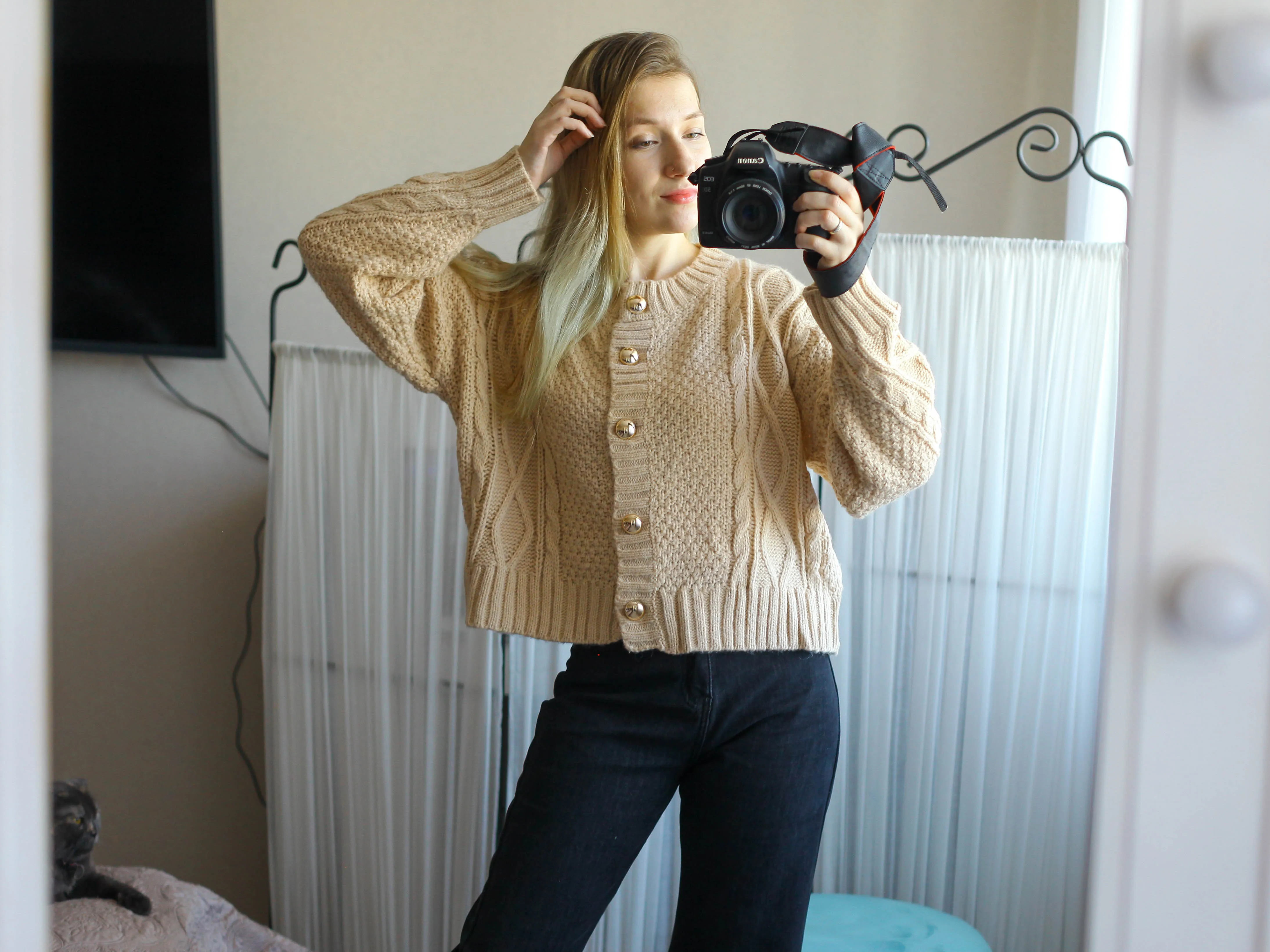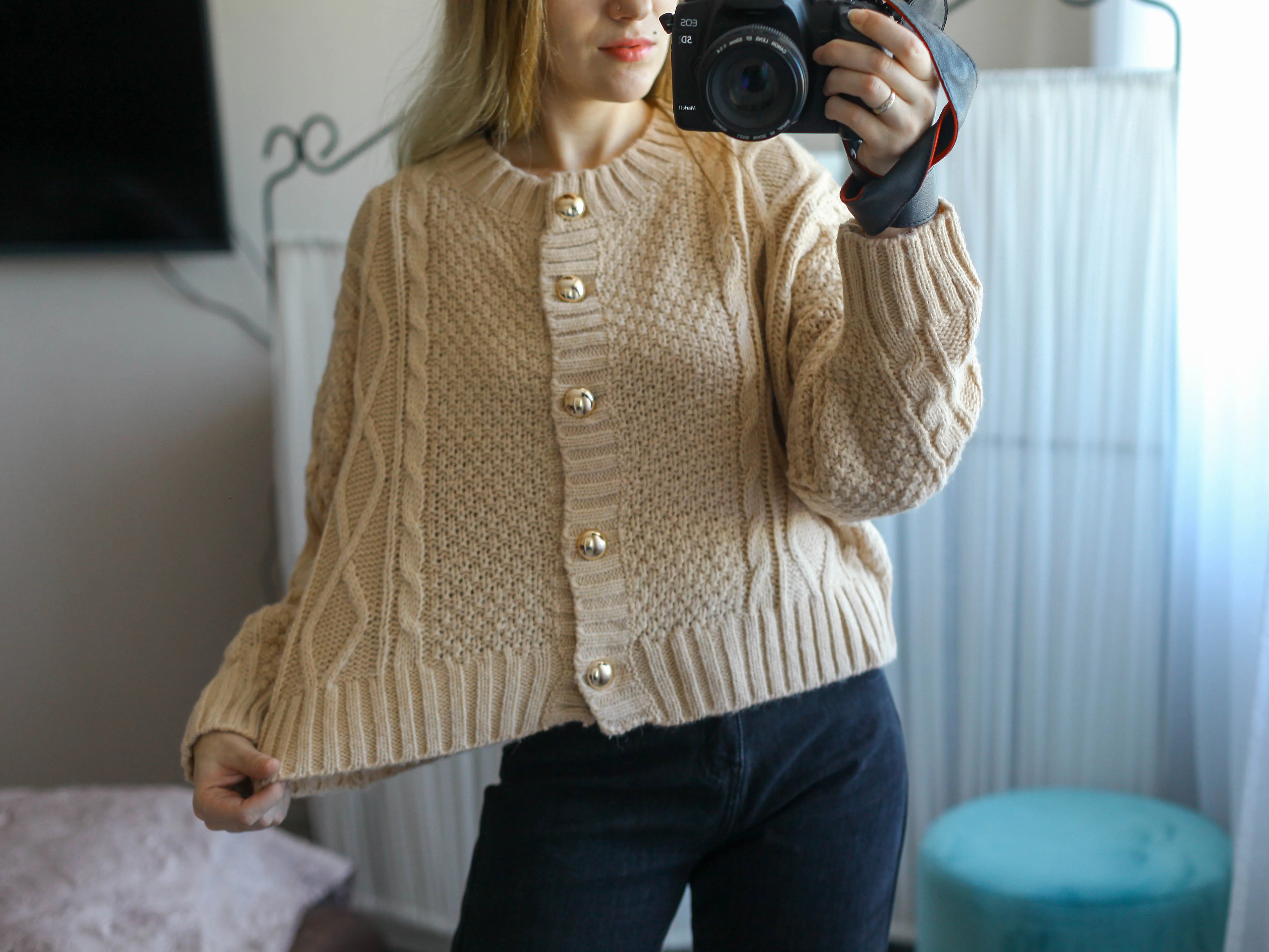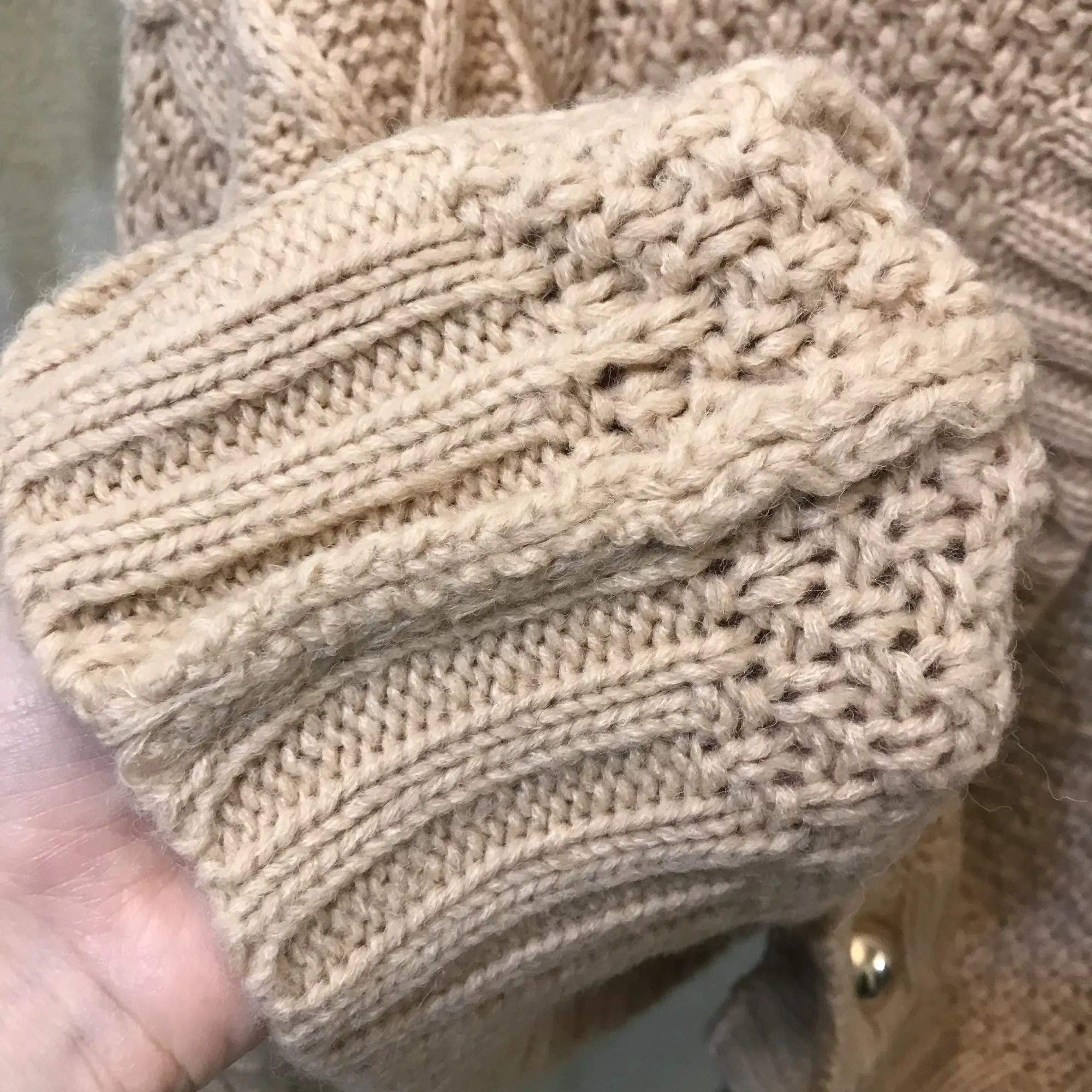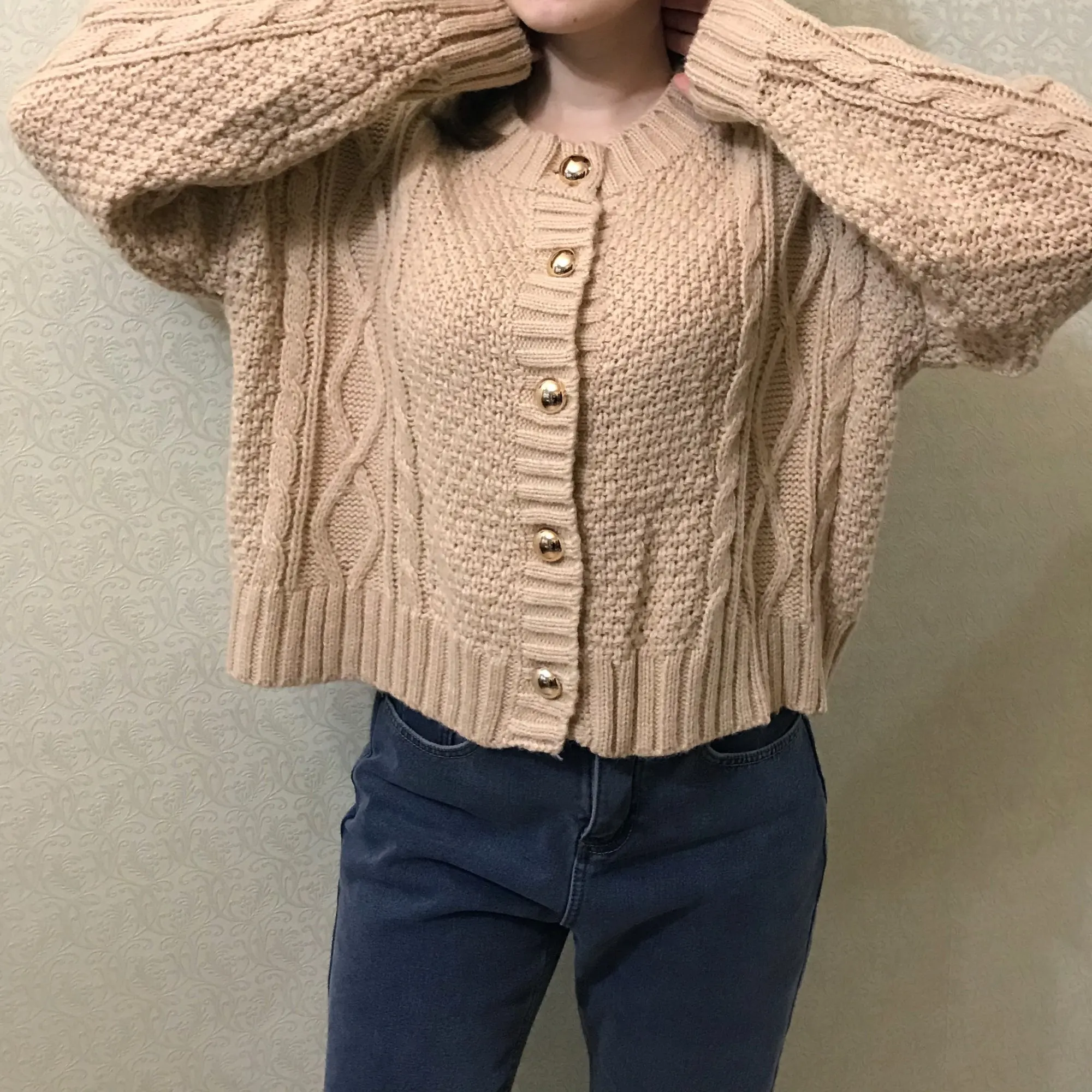 Доставка 3 недели. На параметры 85-71-91, рост 163 см подошло, есть хороший запас. Кардиган на пуговках. Те крупные, золотые. Рукава полной длины, с запасом, подойдут и высоким. Вырез круглый. Вязка ажурная, крупная. Изделие прекрасно тянется. Ткань вполне приятная к телу. Качество очень хорошее. Изъянов не было, лишь одна нитка. Кардиган мне понравился. Такие модели сейчас в моде. Цвет приятный. Фасон удачный. Отличная вещь!)