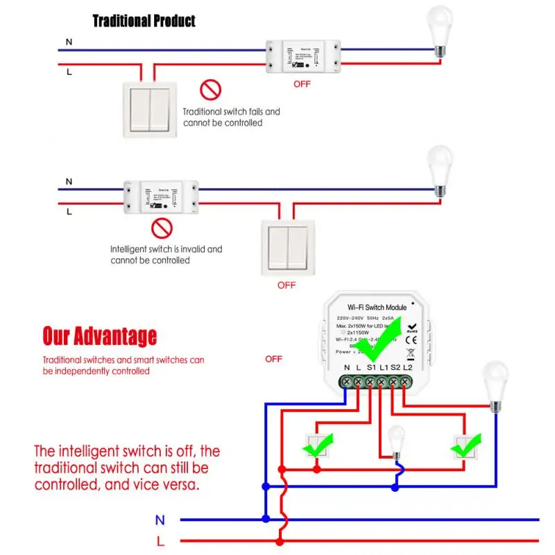 1. Легко Замените традиционный переключатель, чтобы сделать вашу жизнь умнее. Чтобы сделать ваш 2 банд 2-позиционный переключатель умным, вам просто нужно установить один умный переключатель, такой, который подходит для ЕС/Великобритании коммутационной коробки. Пожалуйста, подтвердите размер перед заказом.