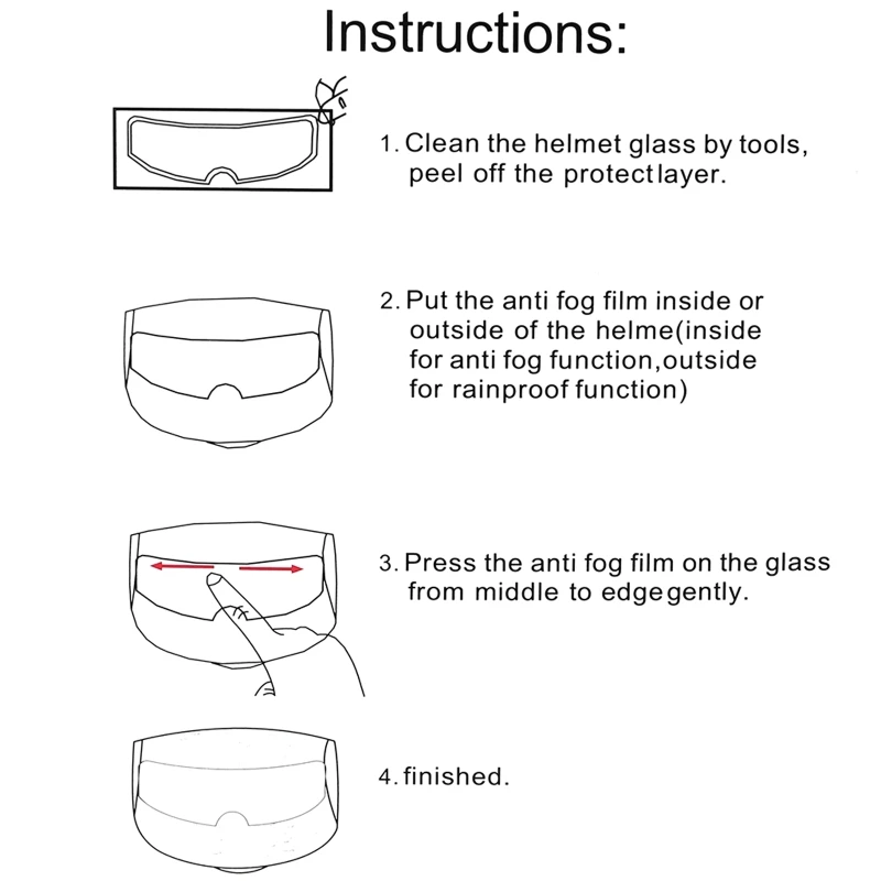 Шаги установки:1. Очистите Объектив шлема с помощью инструмента и Оторвите защитный слой.2. Поместите противотуманную пленку внутри или снаружи шлема (внутренний Анти-туман, внешний Анти-дождь)3. Аккуратно прижмите противотуманную пленку к объективу от середины до края.4. Завершено.