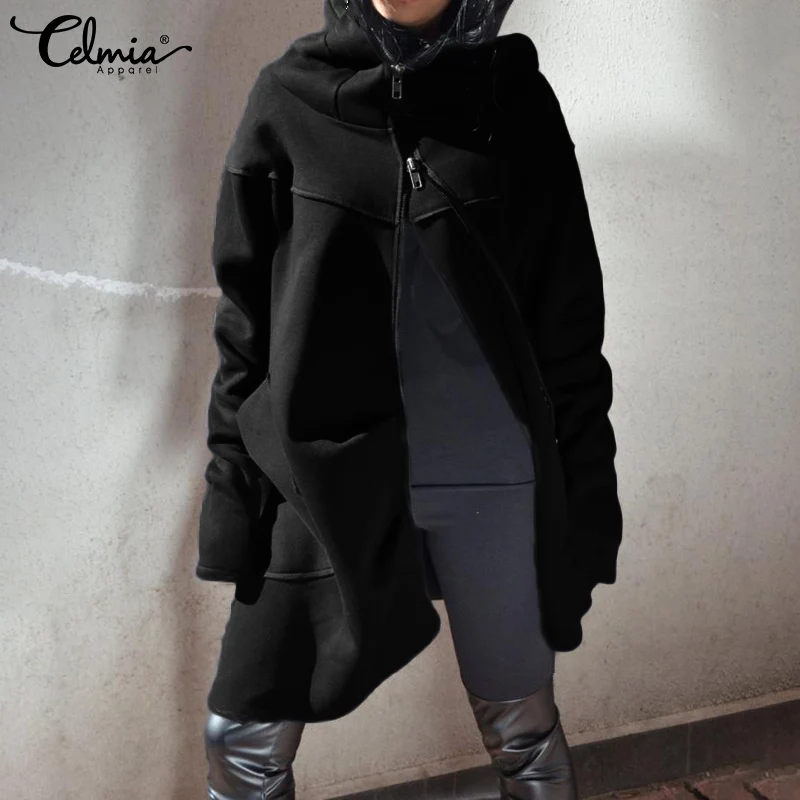 Пальто женское зимнее в стиле оверсайз, длинная куртка Celmia, повседневное свободное асимметричное худи на молнии, однотонный свитшот с капюшоном, осень 2021