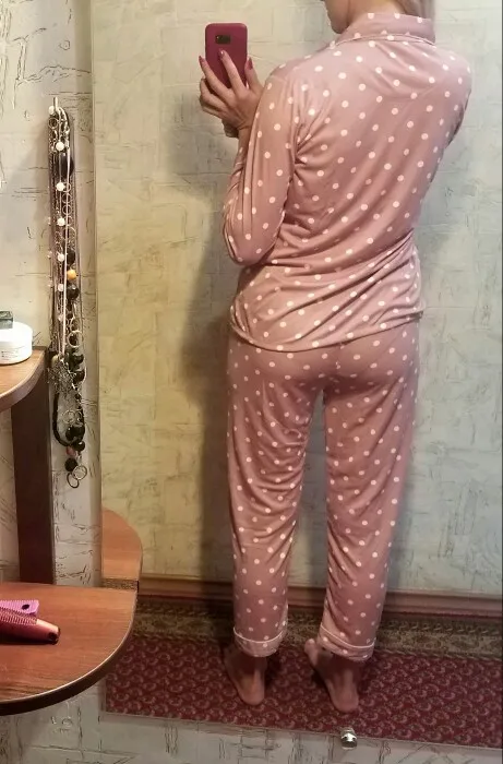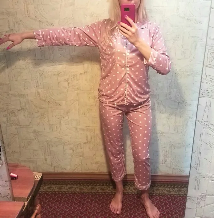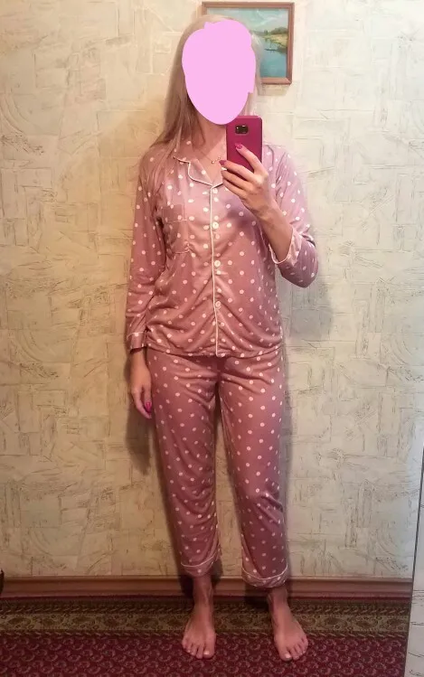Милая пижамка,трикотаж с синтетикой,мягенькая.Пришла на Мист почтомат менее чем за месяц.Приятно! Плюс подарочек от продавца резинка для волос.Я 171см 92-70-96, 59 кг. Размер L на мой рост маловат в длину.Коротковаты штаны и рукава,а по объемам ок. Отдам дочке,она меньше меня.Советую с таким ростом XL.