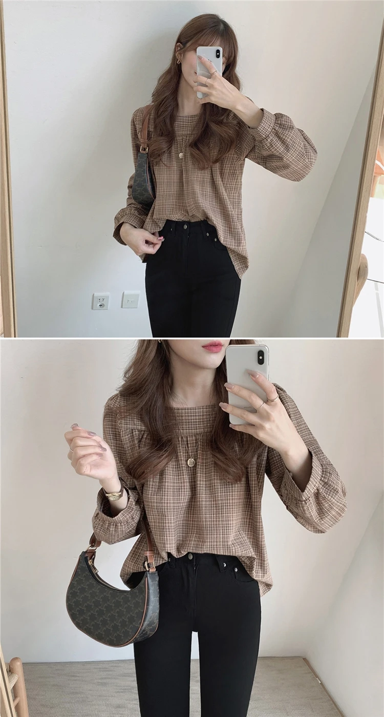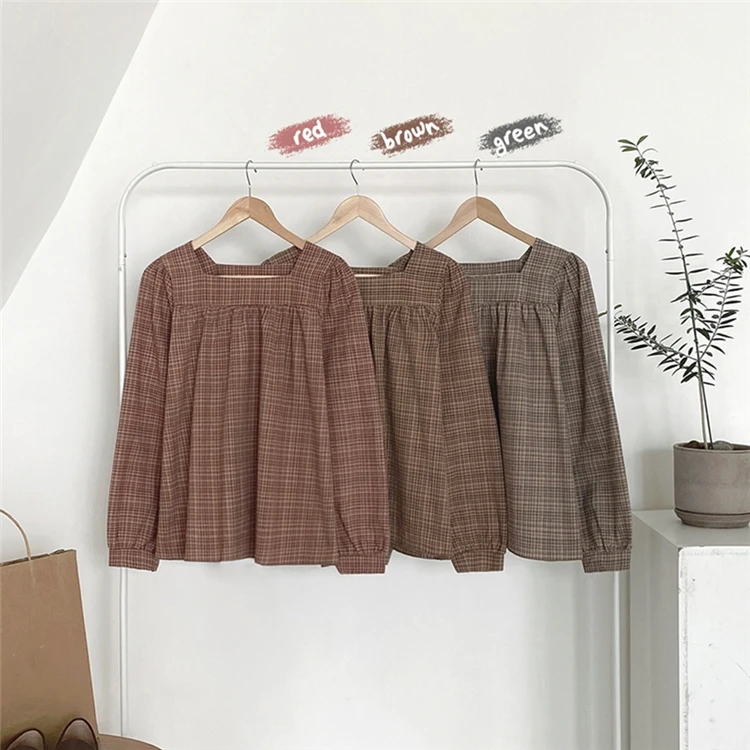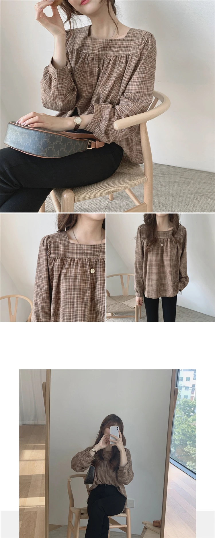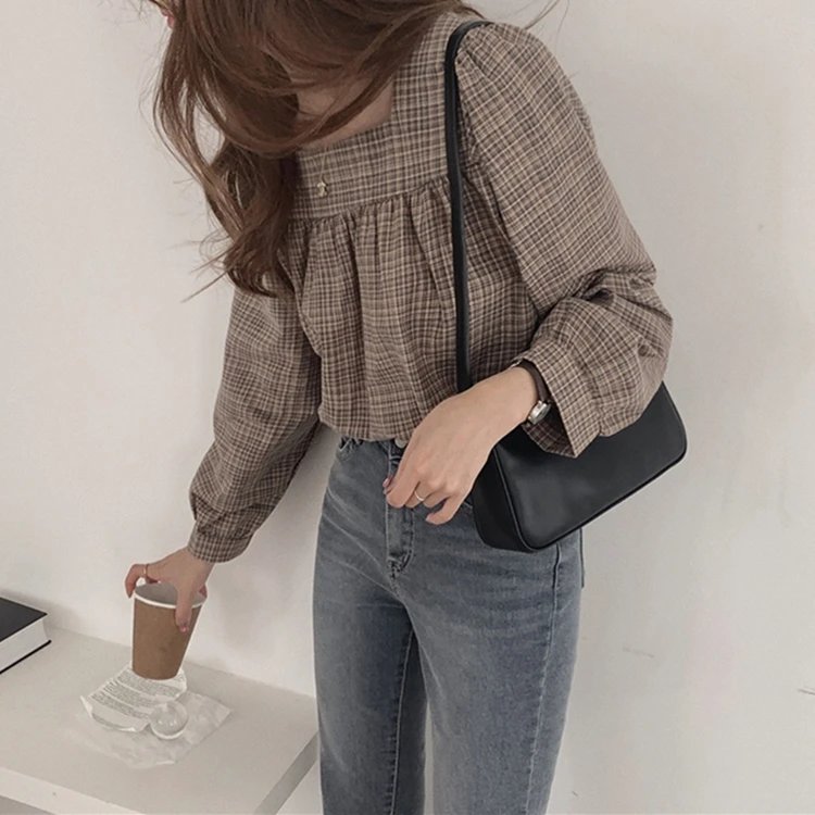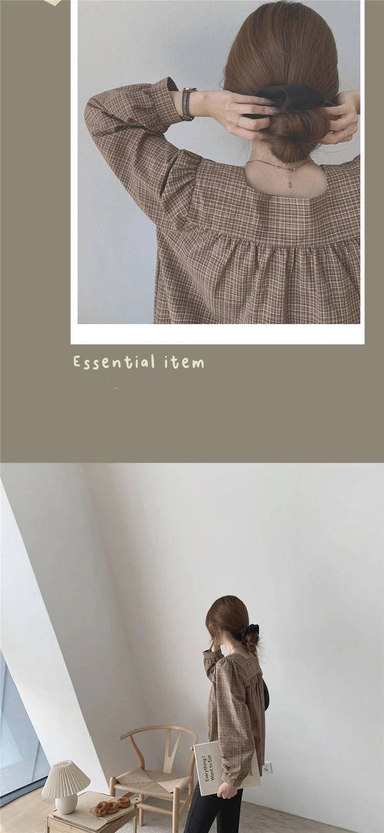 Новинка 2020 осень зима женские блузки квадратный воротник модная клетчатая рубашка дикие Модные большие винтажные женские топы BL3256