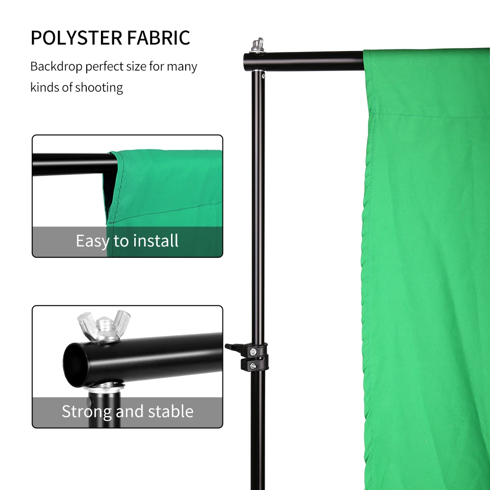 Этот фон может использоваться для профессиональной фотостудии.Держатель фона может поддерживать зеленый, синий, белый, серый, черный экран.Подставка под светильник 2xSupport: 2 м штатив-светильник, регулируемая высота (мин 79cm-макс. 200 см), стабильная и долговечная.4 x перекладина: легко настроить и установить, максимальная нагрузка 3 кг.4x хомута: 2x боковой зажим, отрегулируйте заднюю ткань на лучшее положение. 2x Крепкий зажим, фиксированные предметы предотвращают его выскальзывание.1xCarry чехол: вы можете поместить заднюю рамку в сумку для переноски, легко носить с собой.Цвет: зеленый экран фон тканьРазмер: 3 м * 3 мМатериал: однотонный хлопковый фон из 100% полиэстера, износостойкий, не мнетсяЭта тканевая ткань отличается износостойкостью, устойчивостью к морщинам, гладкостью, удобна в переноске, ее можно стирать в стиральной машине.Он может использоваться для фотографии, видео, телевидения и портрета.Примечание: Длительное складывание фоновой ткани может привести к появлению некоторых складок. Вы можете использовать железо для утюга или повесить на некоторое время, чтобы вернуть его в плоское состояние.Примечание: фон будет иметь небольшую ошибку в размере, если вы ошибетесь с задним фоном с 10 см, это нормально.
