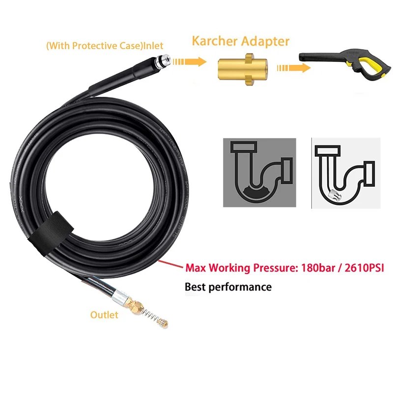 Заказал 15 м, прибыло довольно быстро. Качество самого шланга довольно хорошее, что не понравилось- в отличие от оригинального шланга керхер этот немного какой то пластмасовый, все соединения отличного качества, подключил к пистолету без проблем, 5 минут и можно работать, все герметично , форсунка на конце вообще огонь, бьет ровными струями, очень сильно. попробовал загнать в канализацию вроде идет, но из за жесткого шланга повороты больше 45 гр не проходит, может при теплой воде станет мягче и проидет, летом попробую, а так для прямых участков отлично работает