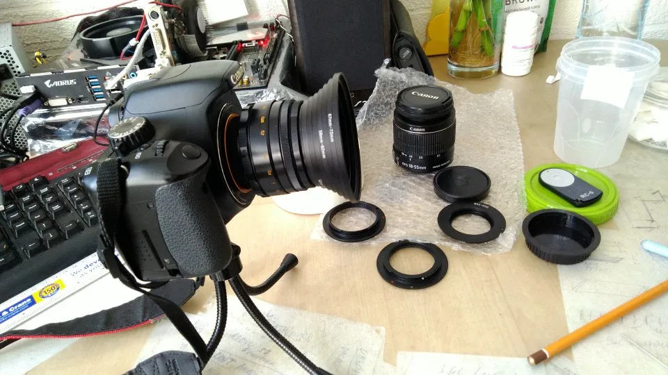 1. Прикрепите адаптер к объективу и прикрепите объектив к камере, когда камера выключена. Включите камеру и установите ее в ручной режим. Установите камеру в режим одиночной съемки. Установите скорость затвора на 1/60 секунды и шаг увеличения диафрагмы на 1/3 EV.