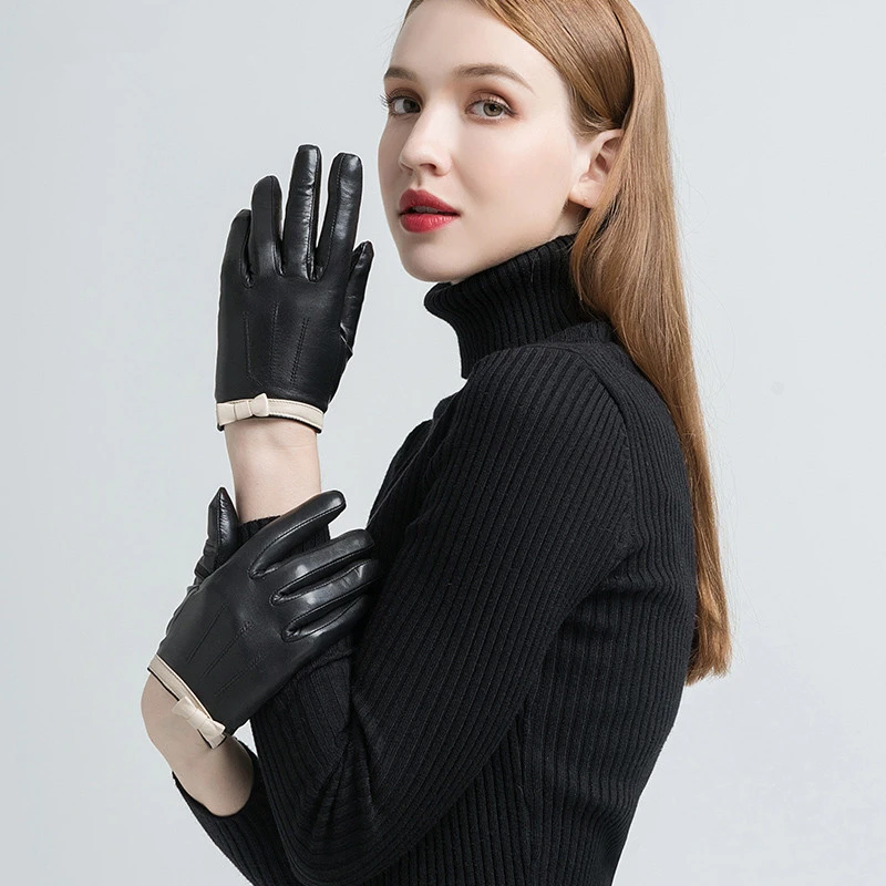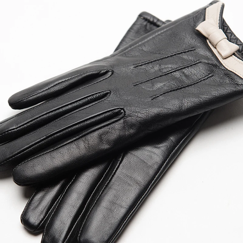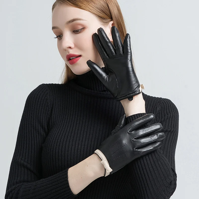 Женские зимние перчатки из натуральной козьей кожи, с бантом