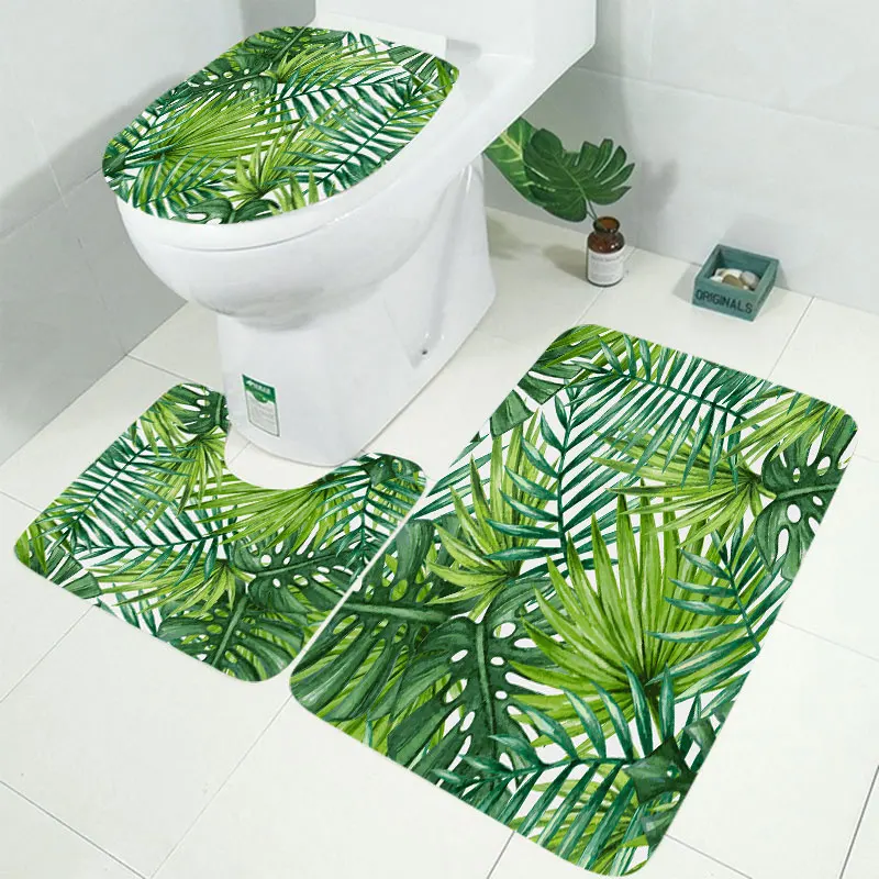 Описание:Зеленые тропические растения и листья, коврик для ванной, занавески для душа, мягкий, 3 шт., набор ковриков, покрытие для унитаза, ванной, водонепроницаемый коврик для унитаза