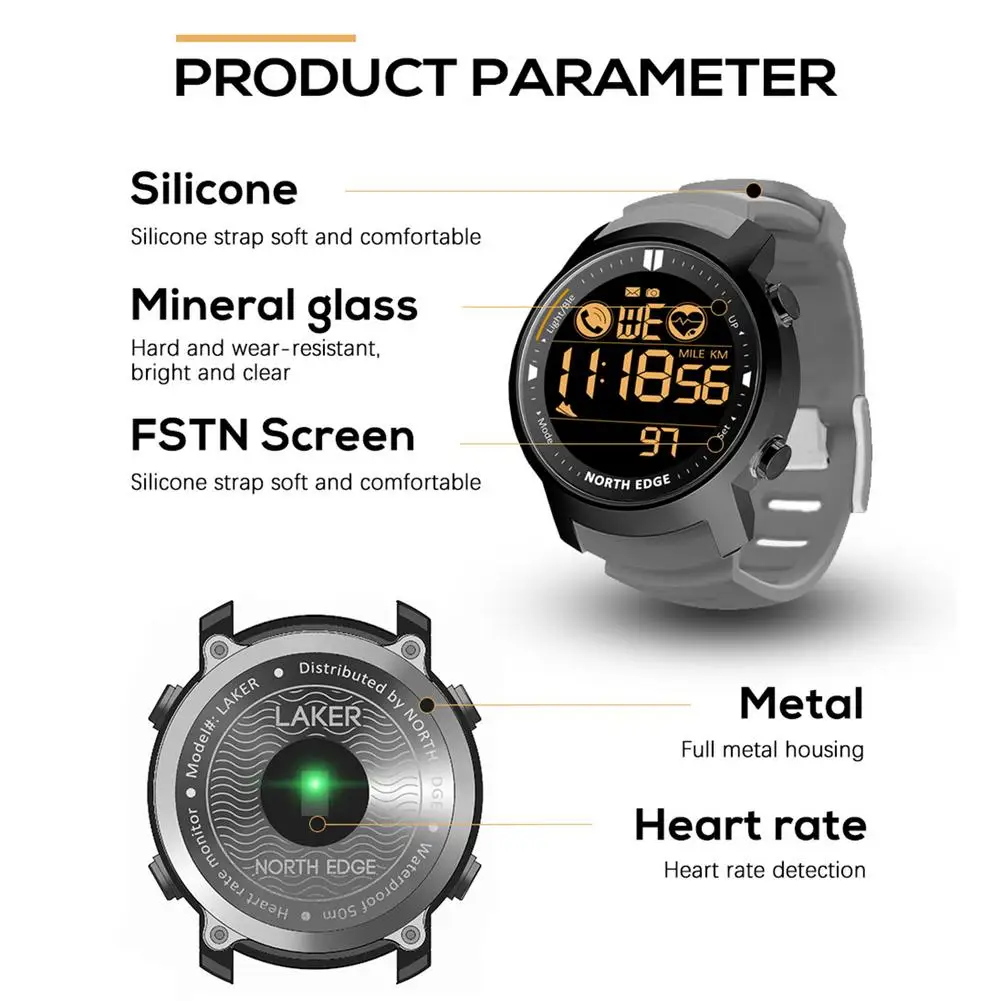 Смарт-часы NORTH EDGE LAKER мужские с пульсометром, умные часы для плавания и бега, спортивные умные часы с секундомером, водонепроницаемость 50 м