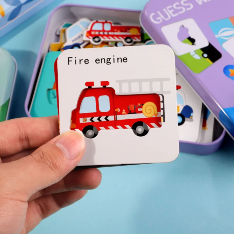 Деревянные игрушки Монтессори, детские головоломки, игра, Мультяшные карты, английский обучающий фонарик, подходящая игрушка для раннего развития, железная коробка