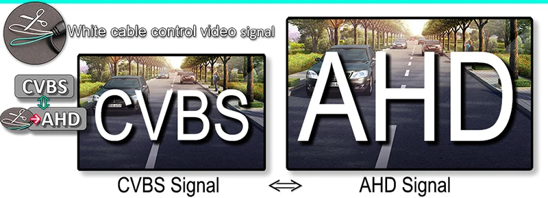 Через управление видеосигналом, он может поддерживать CVBS и AHD дисплеи сигнала.• Камера "CVBS720P-AHD720P": ( CVBS )→ Вырежьте белый экран →( AHD)• Камера AHD1080P:(AHD1080P 1920x1080 175 ° )→ Отрежьте белый экран →( CVBS 1280x720 125 °)
