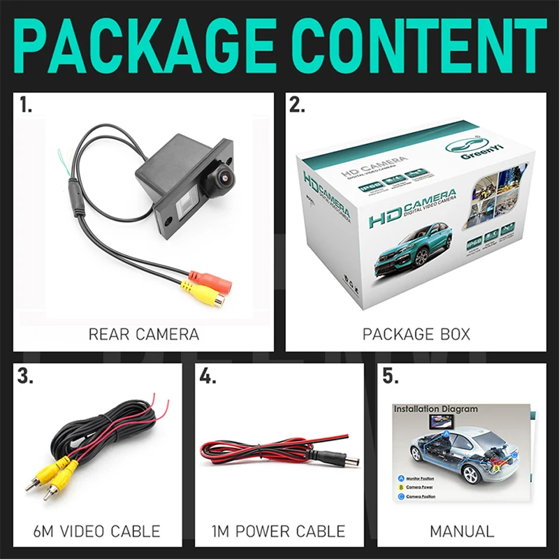 1. CVBS/AHD камера заднего вида2. Коробка для посылка3. Видео кабель 6 м4. Кабель питания5. Руководство пользователя