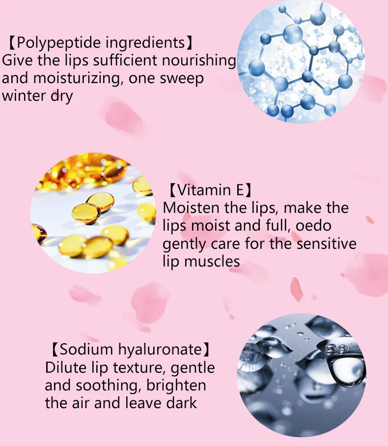 Нежные губы и нежные губы, не трескаются, шелушатся, линии губ темные и тяжелые 1. Гидрат Множественная увлажняющая формула, быстро проникает в губы и образует воду 2. Питание Натуральное растительное масло, глубоко питающее, нежное и мягкое для губ oedo 3. Устраняют линии губ Уменьшить линию губ, пусть губы пухлые и гладкие, плотные и эластичные 4. Яркий цвет губ Отвергайте темные раковины и увеличивайте нежность губ oedo