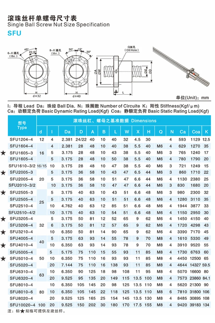 Model NumberSFU1204 SFU1605 SFU1610 SFU2005