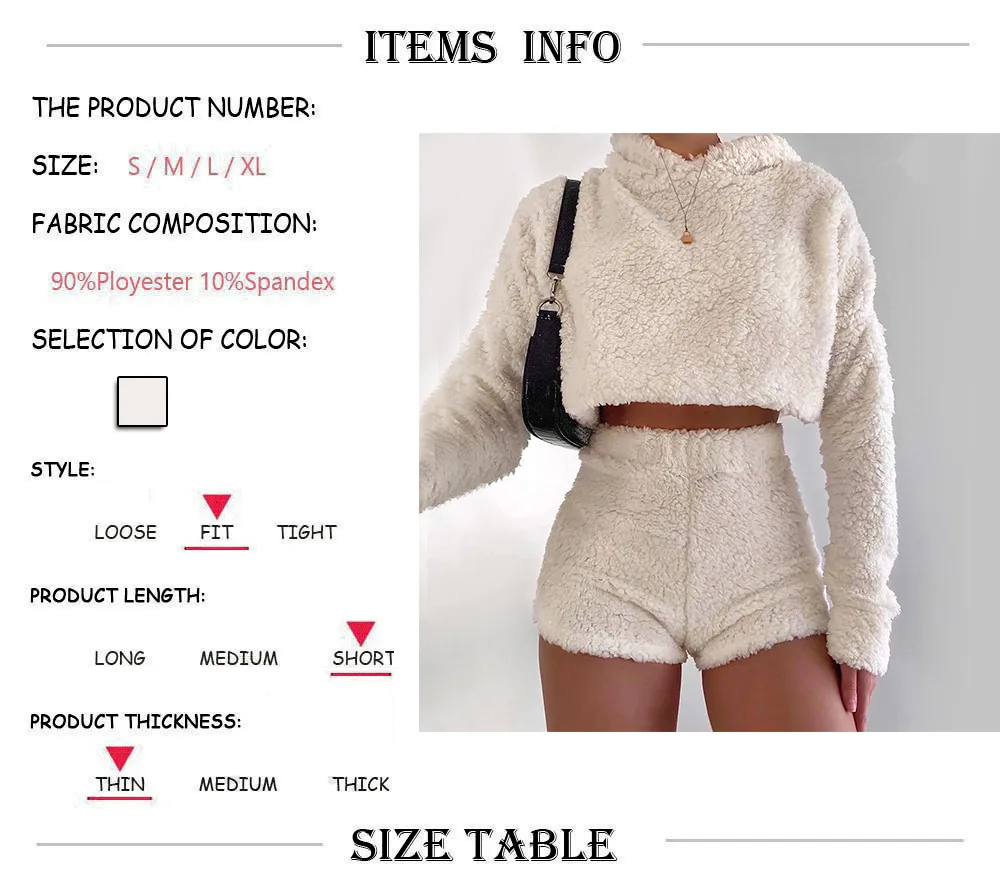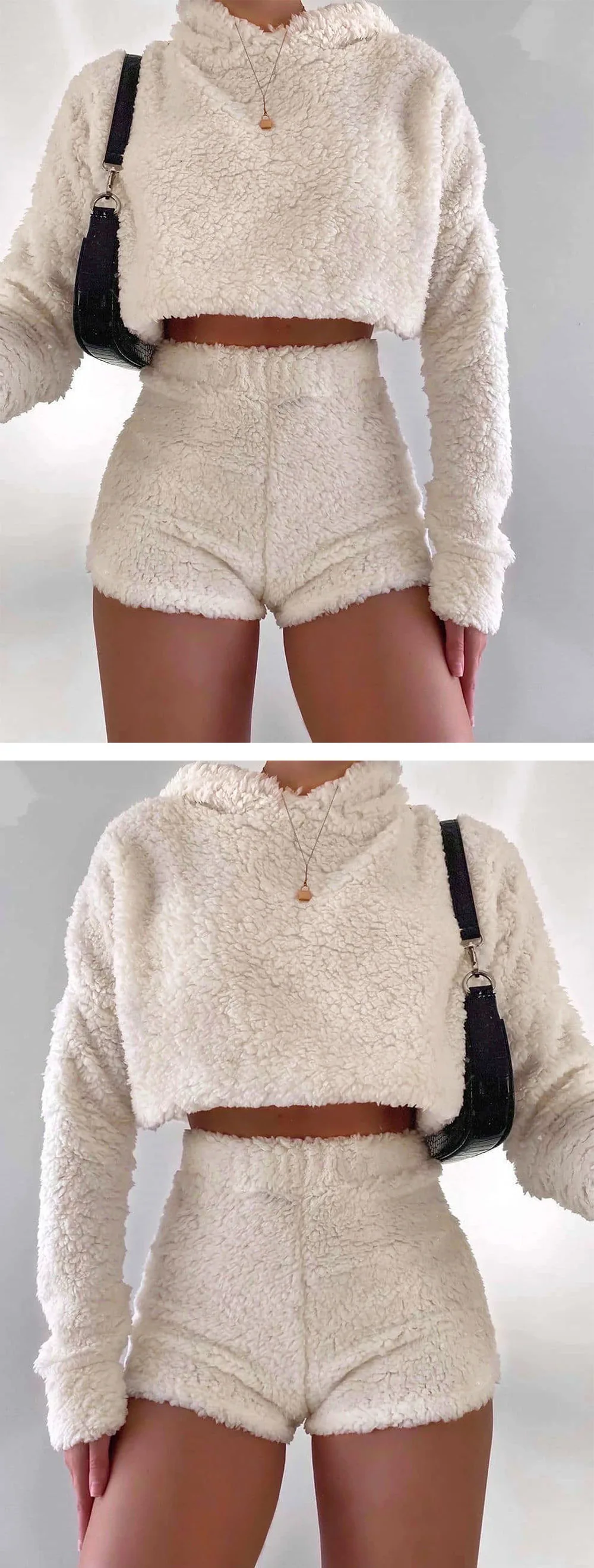 Женские пушистые костюмы из двух предметов, теплый шерстяной костюм, толстовки с длинным рукавом и капюшоном и короткие брюки, однотонная повседневная одежда, осень-зима