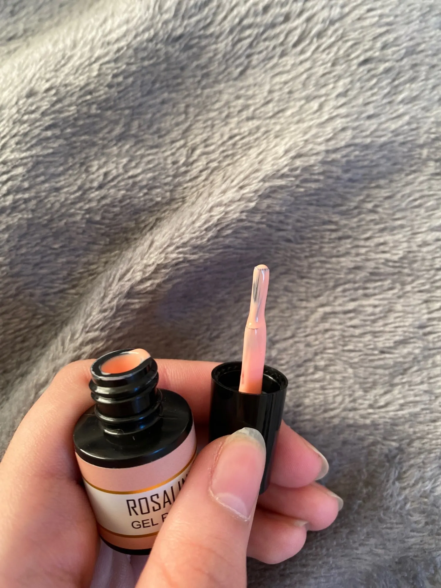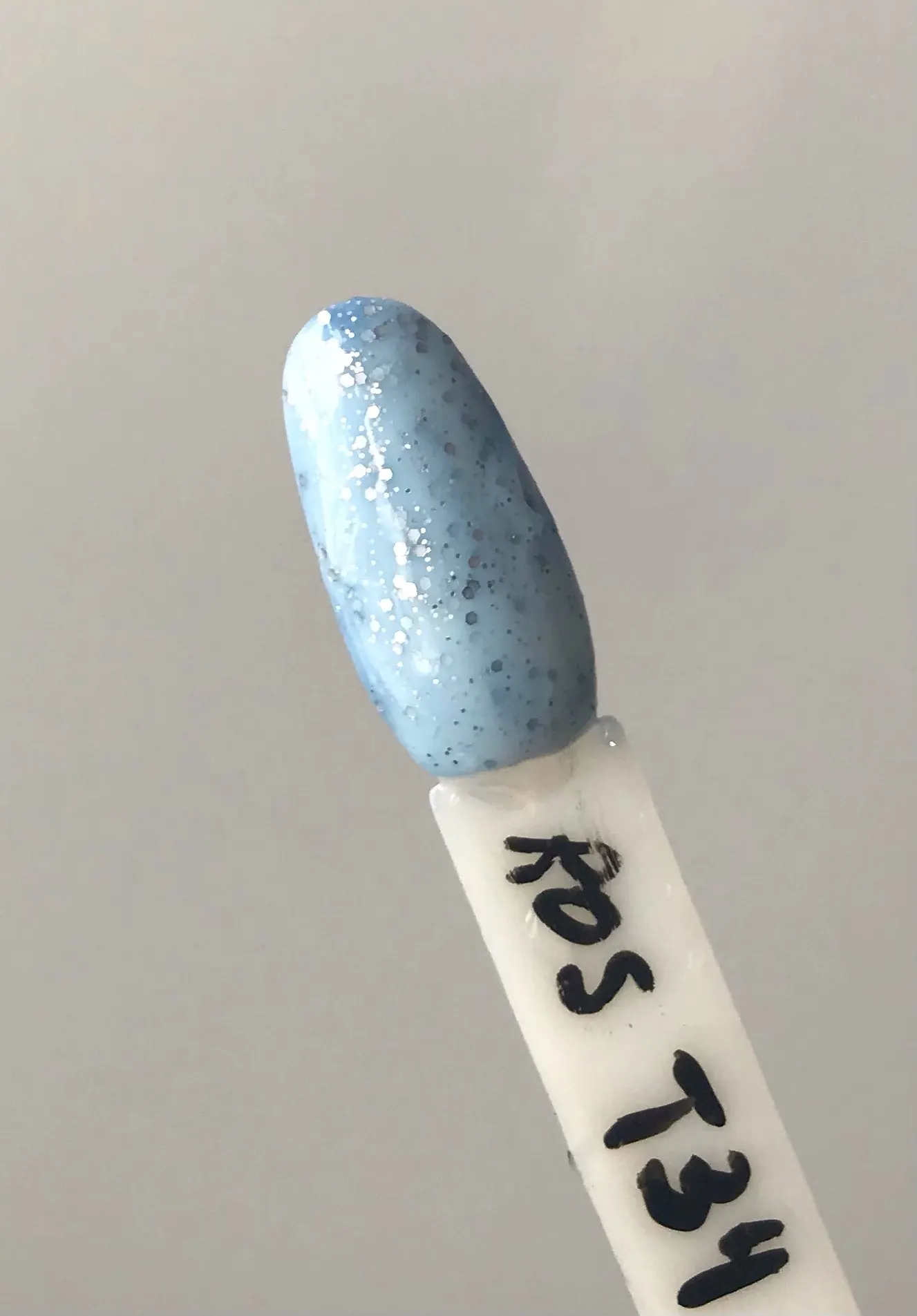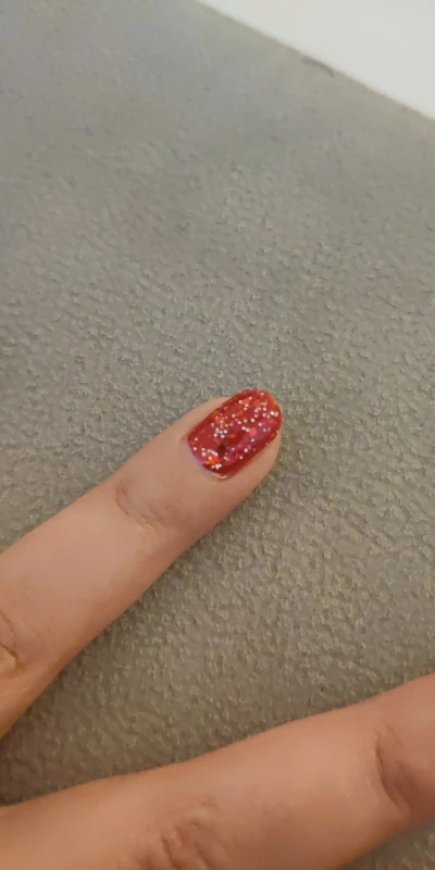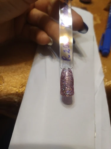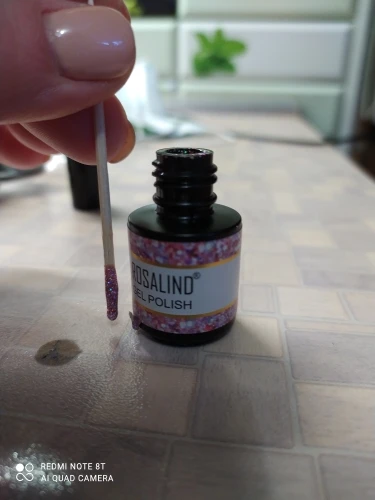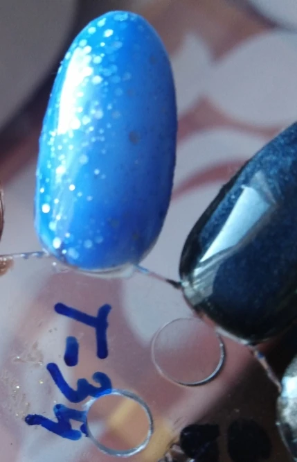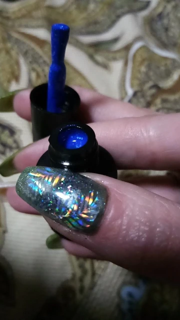 Пришёл за две недели. Бутылочка маленькая, налита неполностью. Очень густой продукт. Блёстки крупнодисперсные (у продавца на фото как пыльца, в реале же кругляшки) и при нанесении распределяются неравномерно. Хорошо реагирует на смену температуры. Из-за густоты несамораспределяющийся. Делала в два слоя.