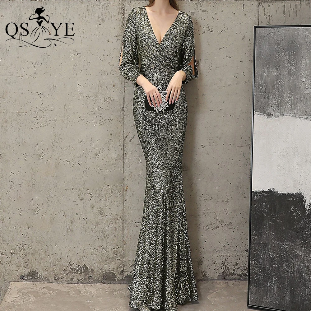 Женское длинное вечернее платье с блестками, черное золотистое платье с длинными рукавами и бусинами, вечернее платье с юбкой-годе, платье знаменитости с V-образным вырезом для выпускного вечера
