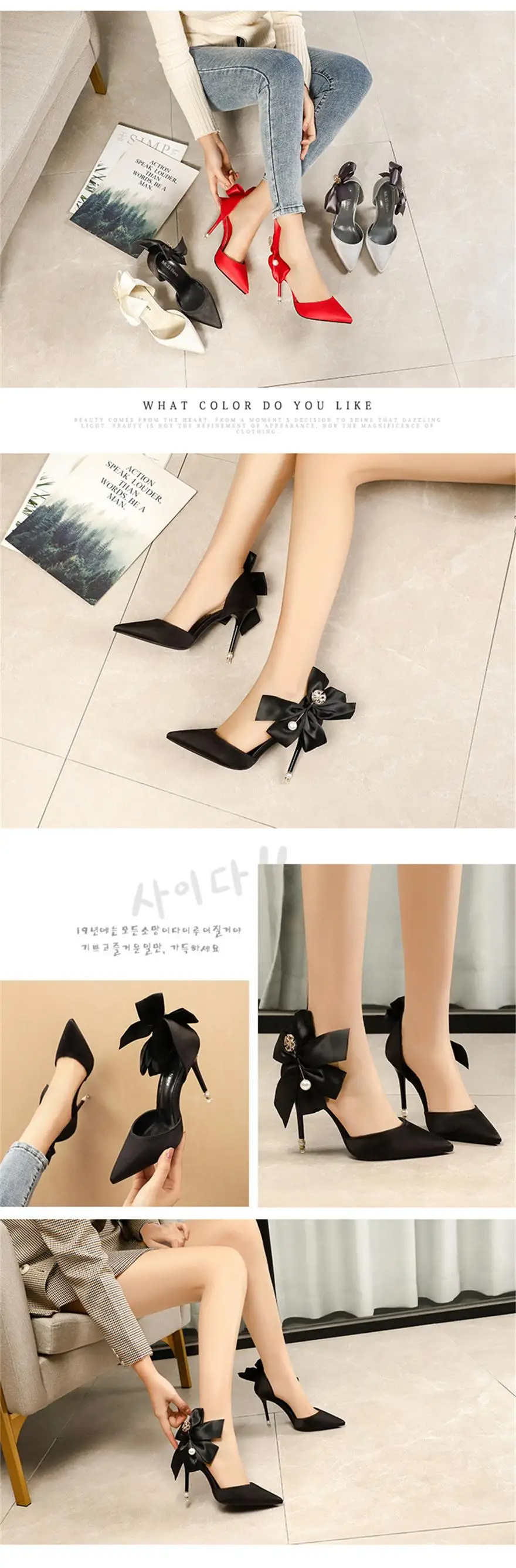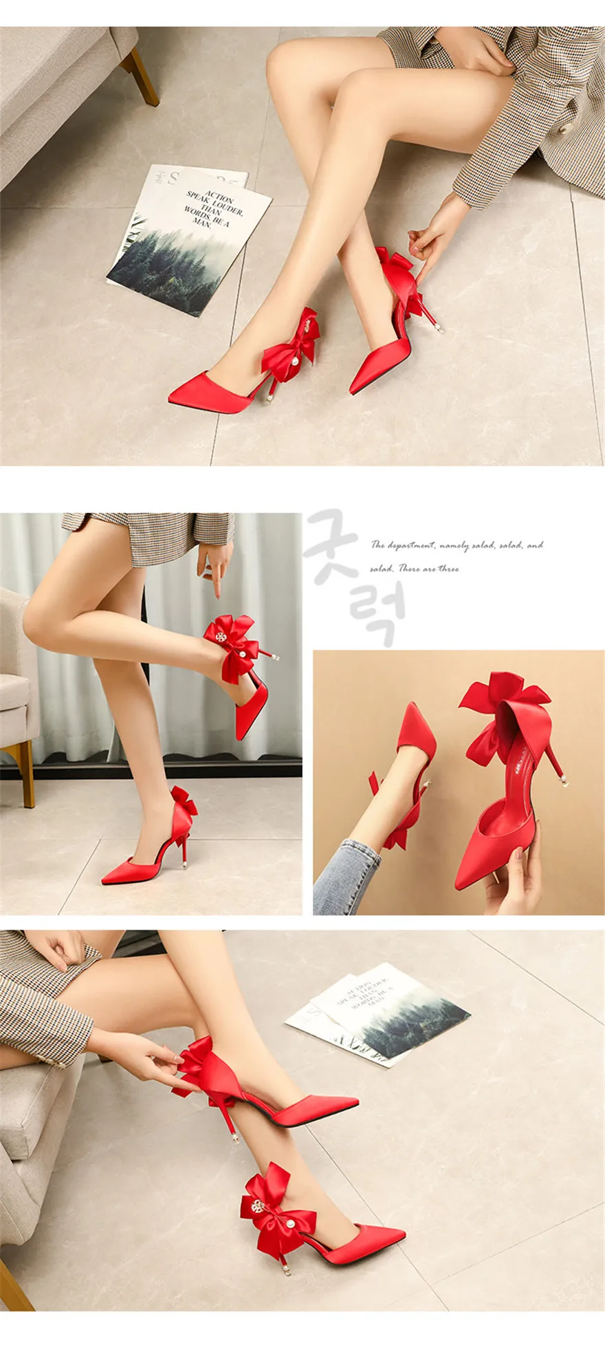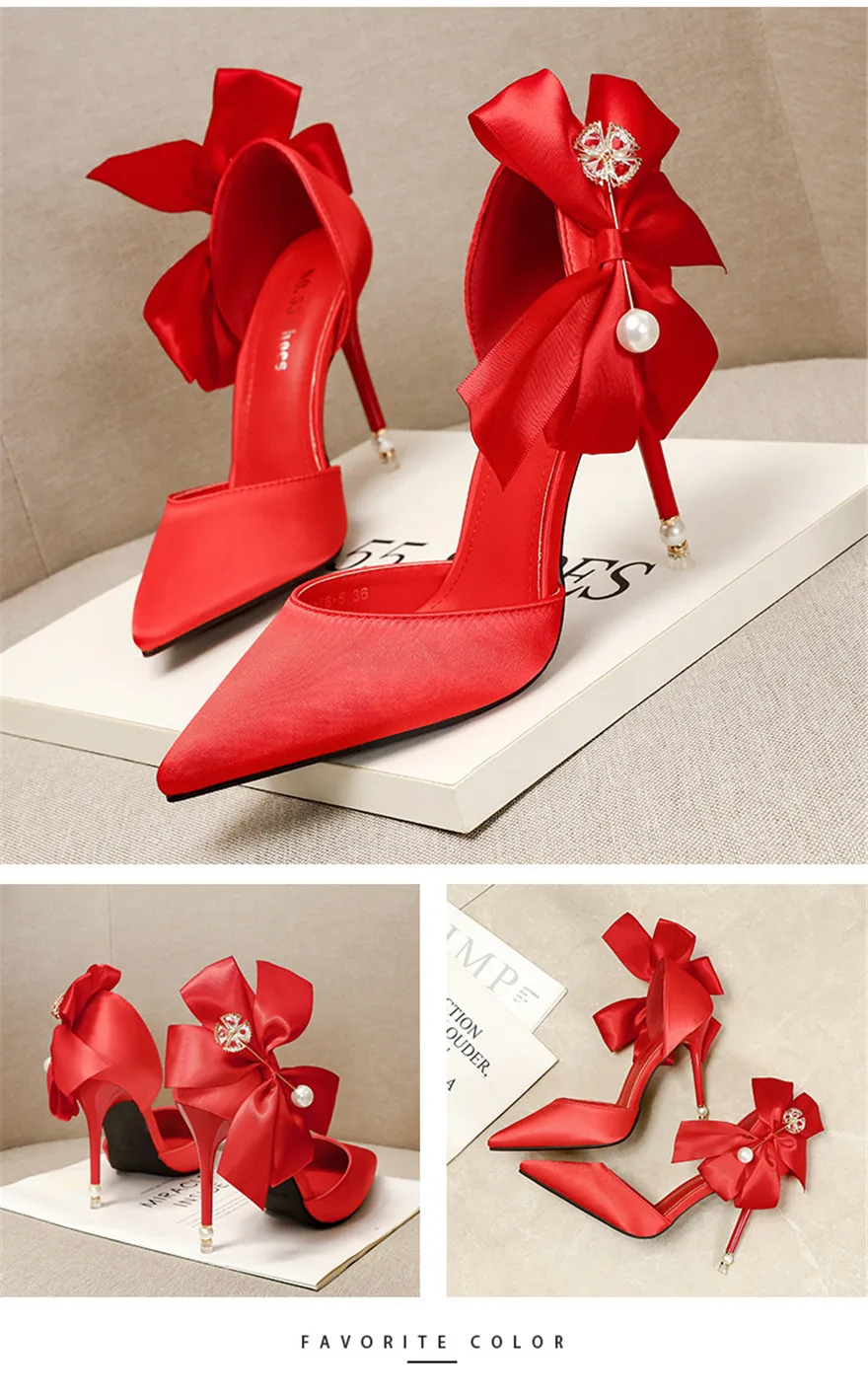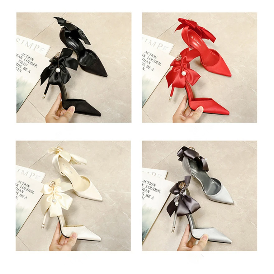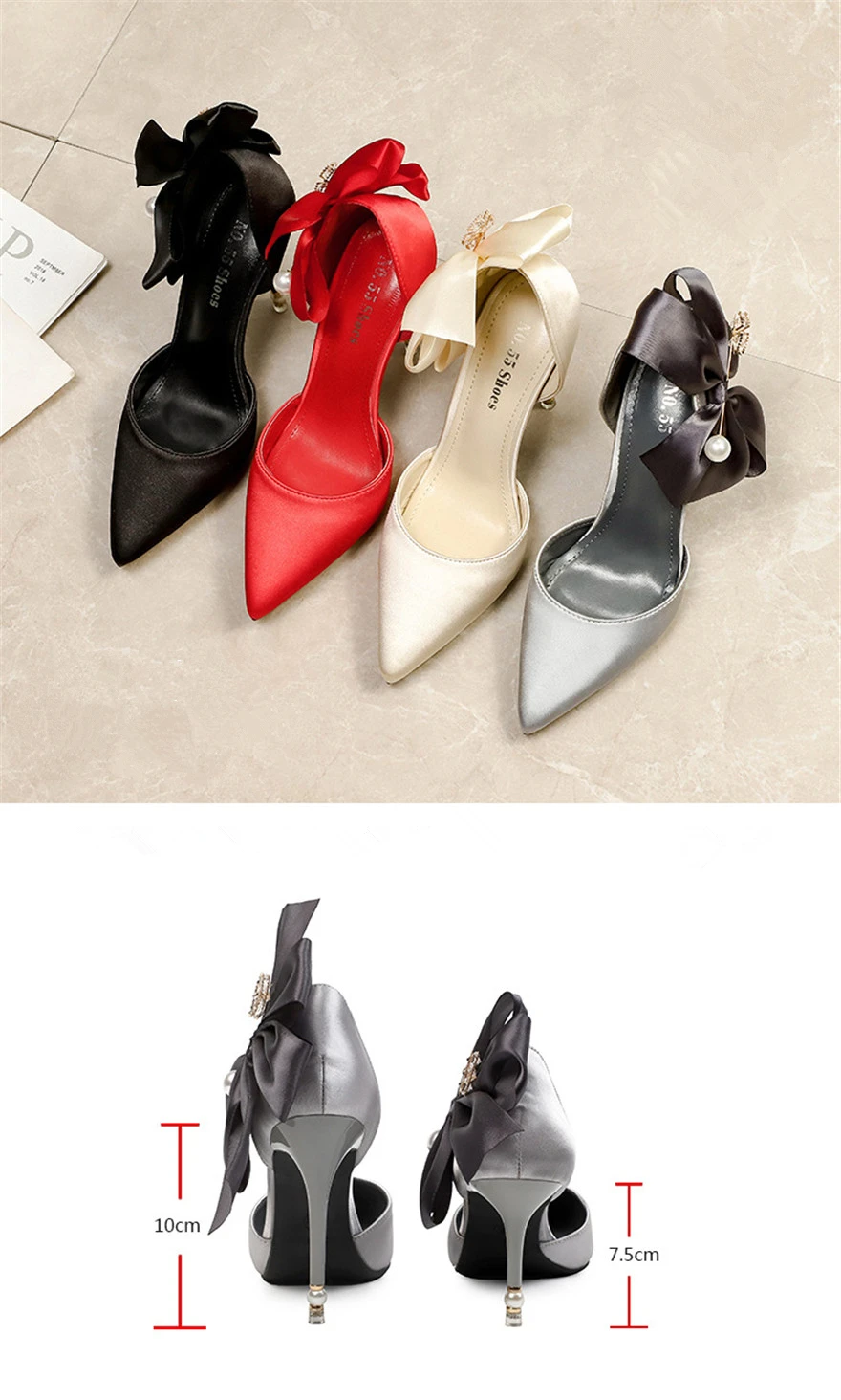 Босоножки женские свадебные с бантом и жемчугом, шелковые туфли-лодочки на высоком каблуке, заостренный носок, красные, черные вечерние Большие размеры 34-43