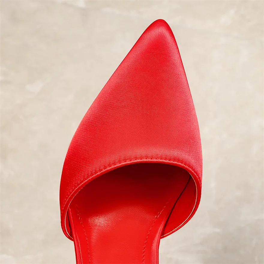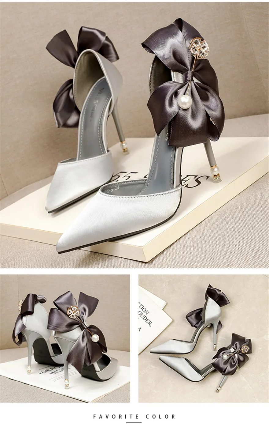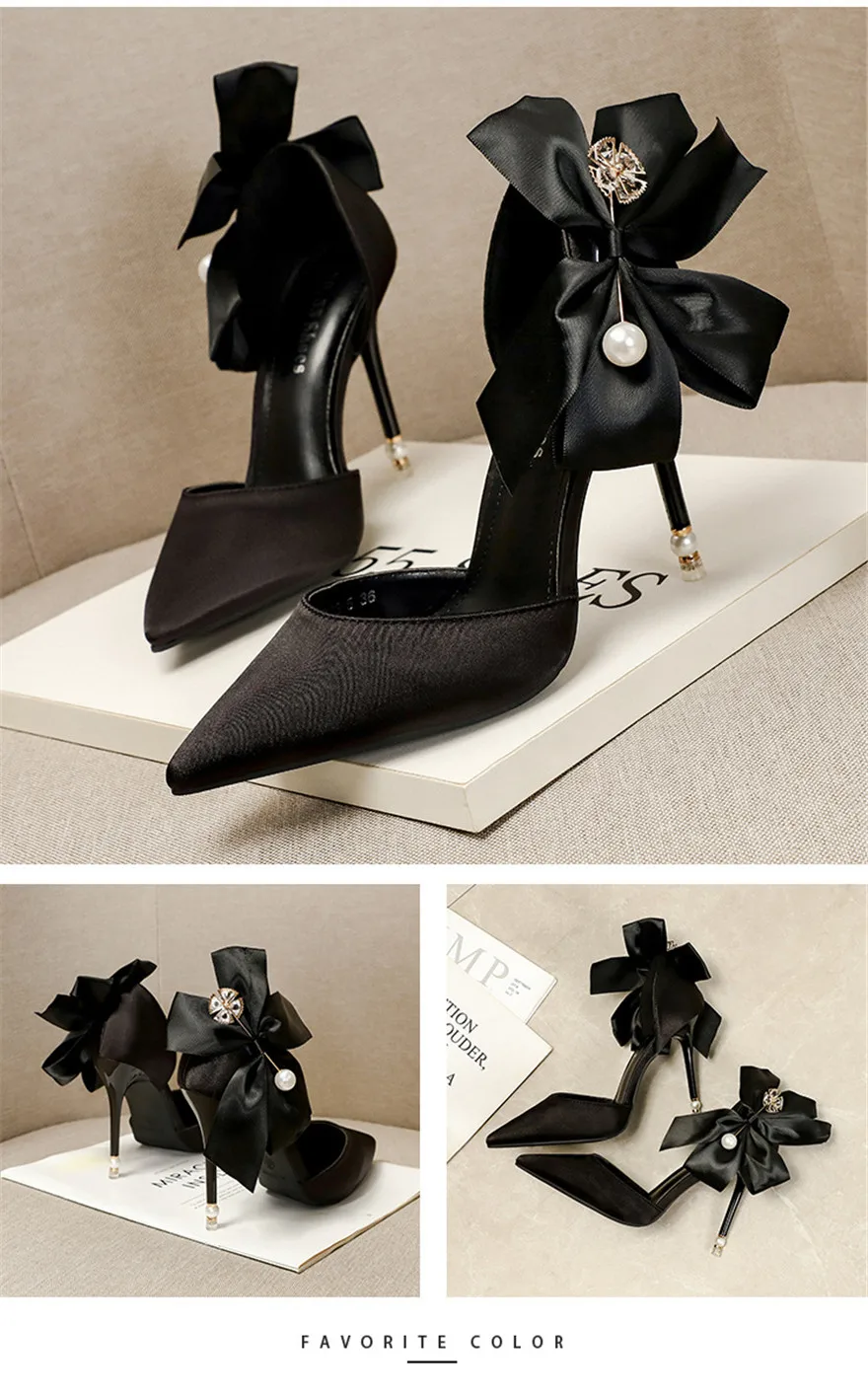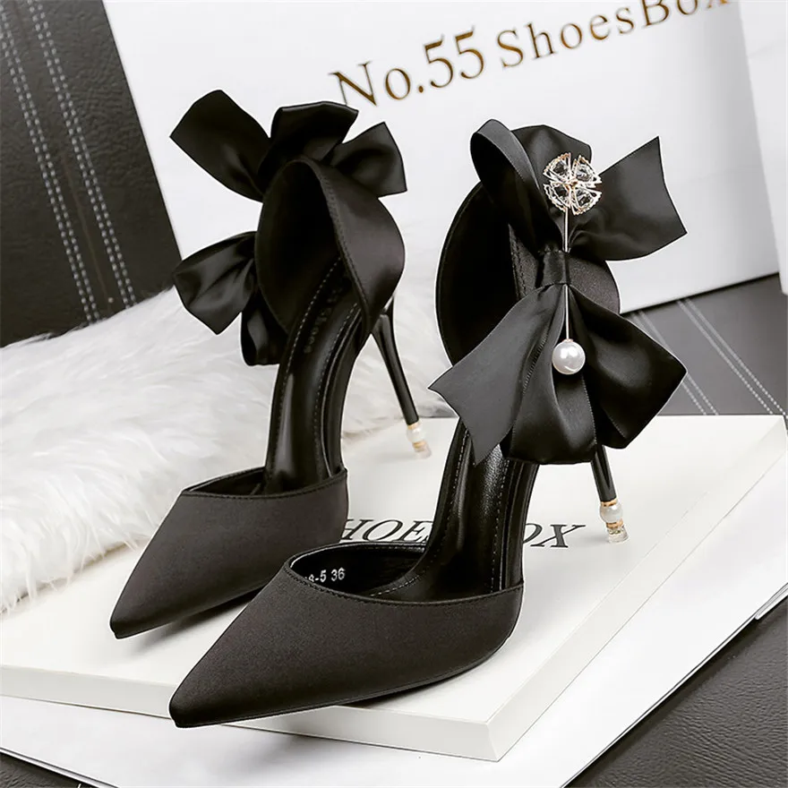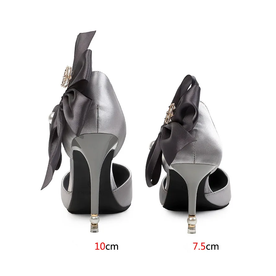 Босоножки женские свадебные с бантом и жемчугом, шелковые туфли-лодочки на высоком каблуке, заостренный носок, красные, черные вечерние Большие размеры 34-43