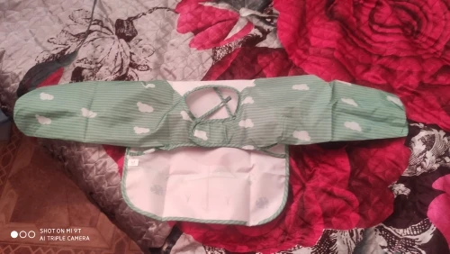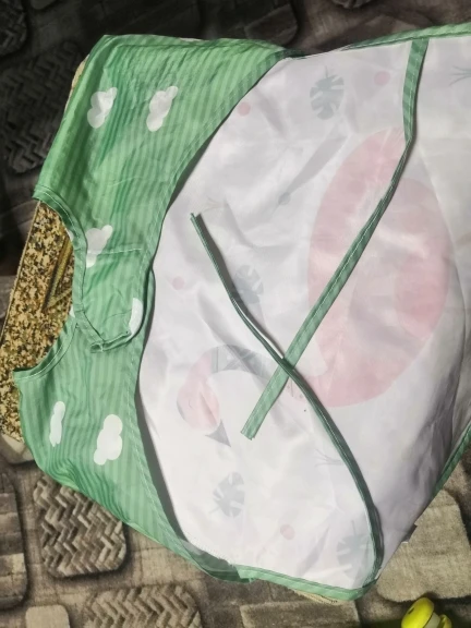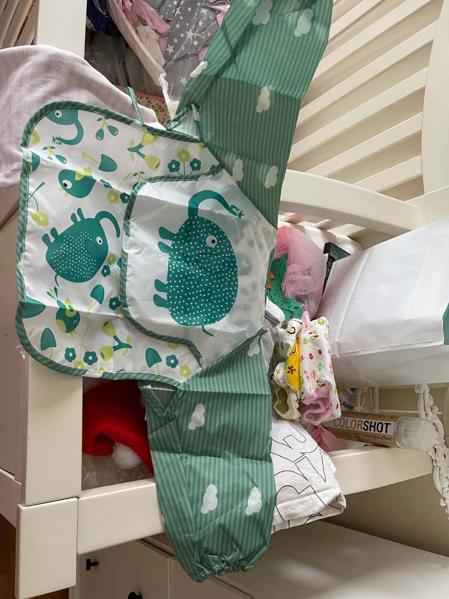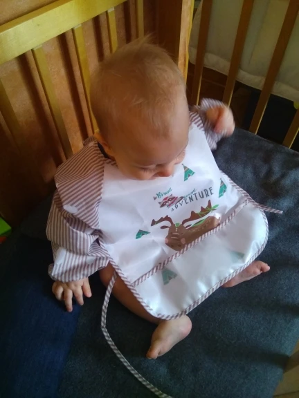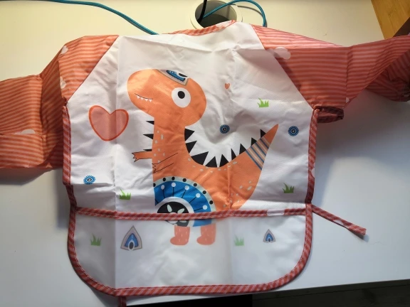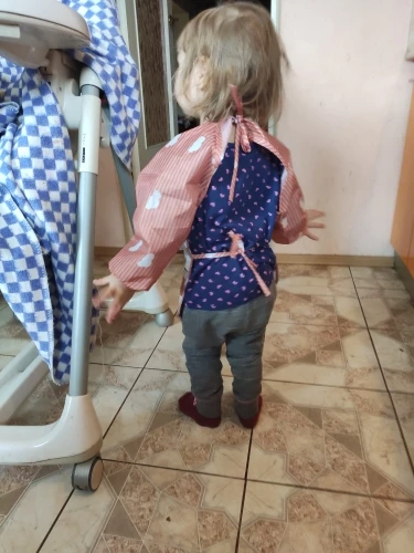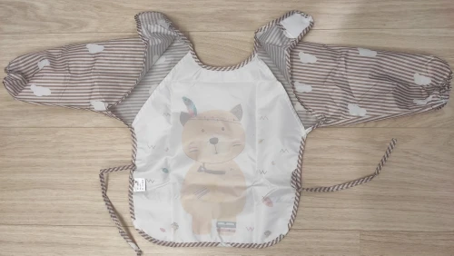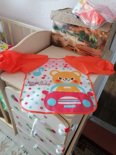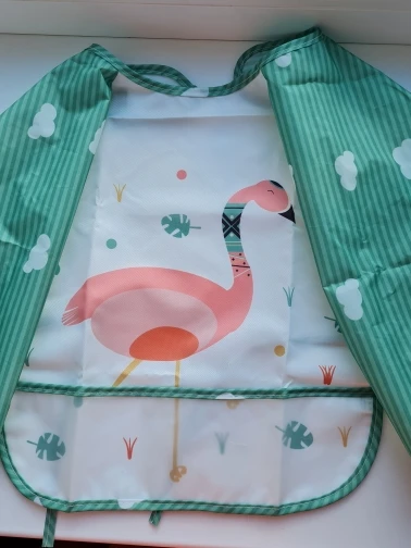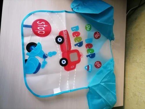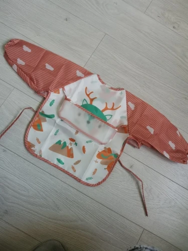 Хороший непромокаемый фартук с рукавами. Защита рук - отличная вещь, т.к. обычные рукава не плавают в тарелке), манжета хороша (вошла даже рука взрослой женщины), кармашек снизу нормально отлавливает куски всего падающего). Благодаря застежкам сзади, вероятно, можно будет использовать лет до трех. Хочу второй такой для творческих занятий типа красок, пластилина и т.д.